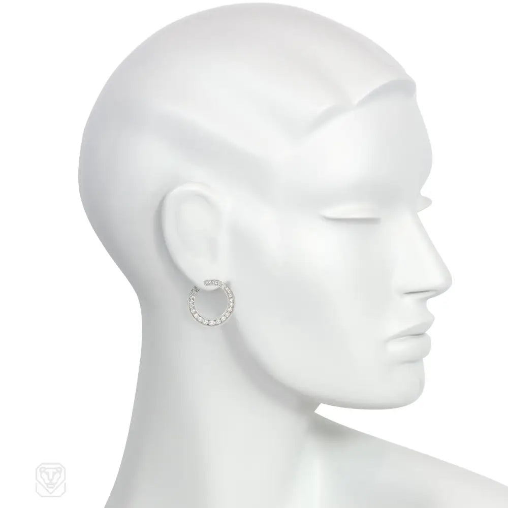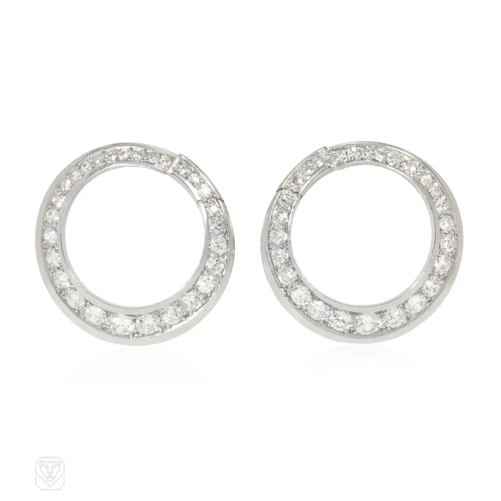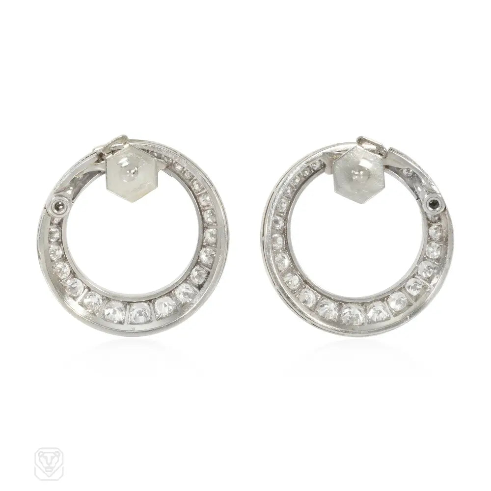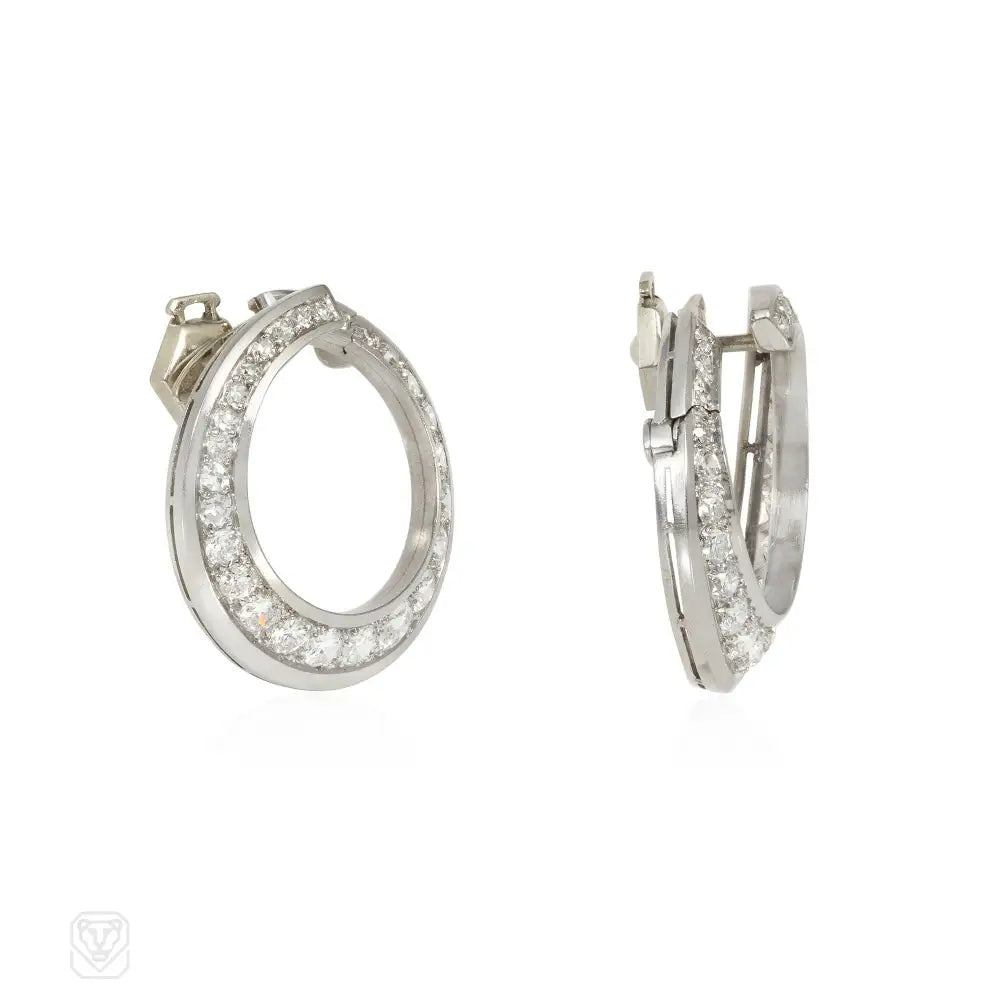 A pair of Art Deco front-to-back diamond hoop earrings of tapered design, in platinum and 18k gold. France. Atw 3.5ct