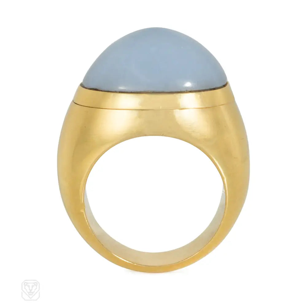 A gold bombé ring with two interchangeable lozenges of lilac and green chalcedony, in 18k. France