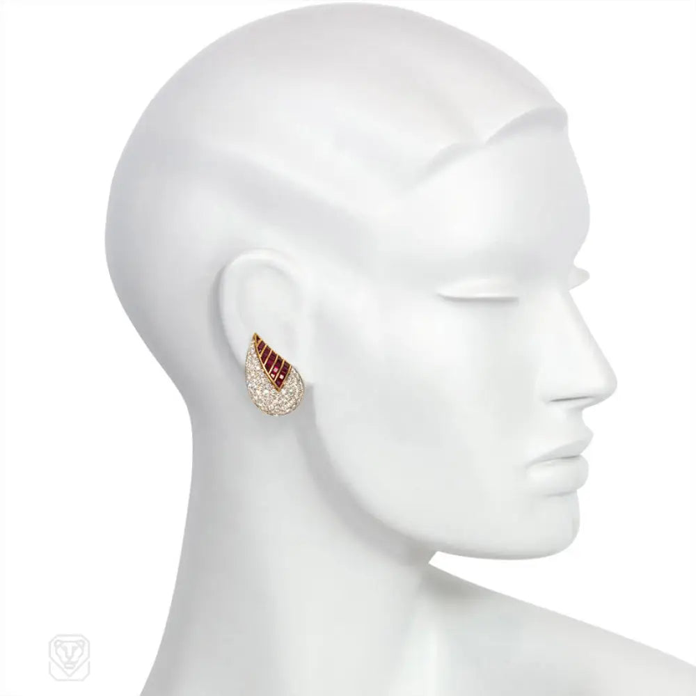 A pair of two-color gold earrings in the form of leaves comprised of pavé diamonds and calibré cut rubies, in 18k. Fasano, Italy. Atw. 5.00 ct. diamonds.