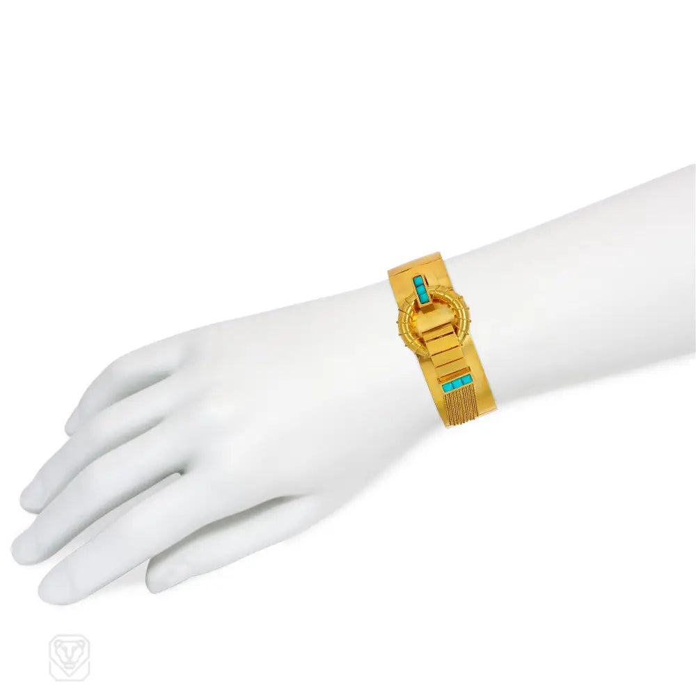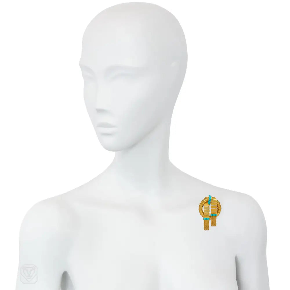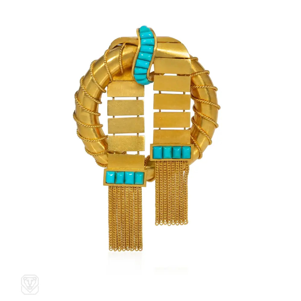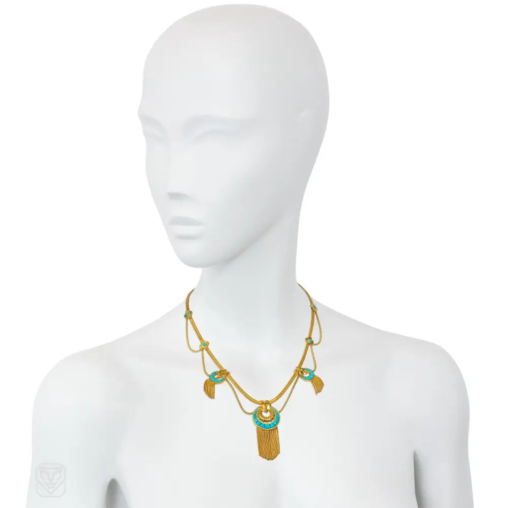 A Victorian turquoise and gold parure consisting of a festoon necklace, suspending three toruses, each featuring a filigreed gold disc set within a graduated surround of sugarloaf turquoise, and terminating in gold fringe, with swags of gold beads, and further embellished with turquoise and gold flowers; the earrings featuring juxtaposed, articulated panels terminating in sugarloaf turquoise and gold fringe, issuing from filigreed gold toruses, further suspended from sugarloaf turquoise and gold elements, with wire backs; the cuff bracelet centered by a filigreed gold torus secured east-to-west by further sugarloaf turquoise and gold elements, and terminating with gold fringe on one end; the brooch also in the form of a filigreed gold torus, surmounted by a serpentine turquoise and gold element, suspending juxtaposed and articulated gold panels, terminating in buff-top turquoise and gold fringe; the entirety in 21k. France. With an antique fitted presentation box.