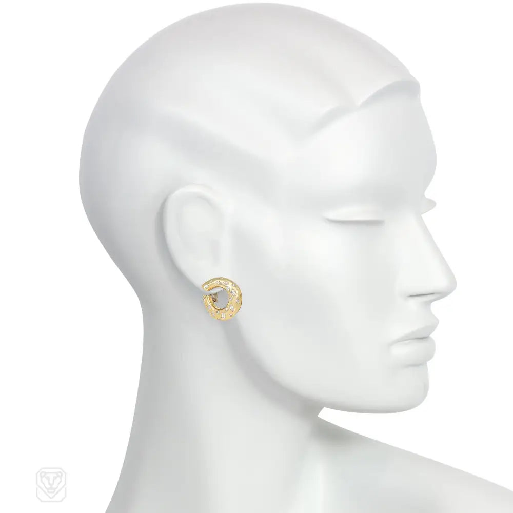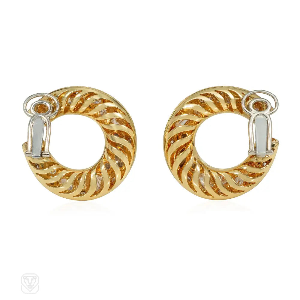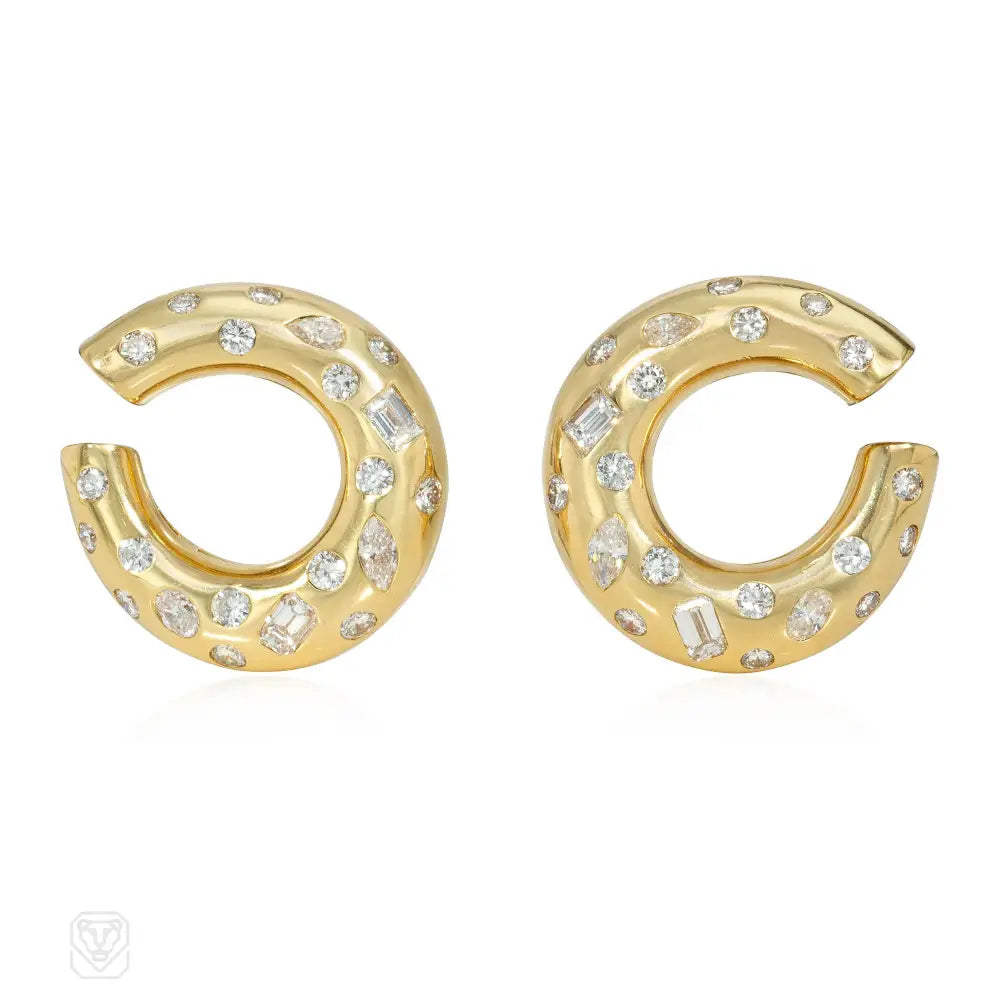 A pair of gold and diamond hoop earrings adorned with a variety of fancy cut diamonds, including emerald cuts, marquises, round brilliant cuts, baguettes, and movals, in 18k. Italy. With Italian registration number for RCM Ricci & Co., Valenza. Atw diamonds 3.25 cts.
