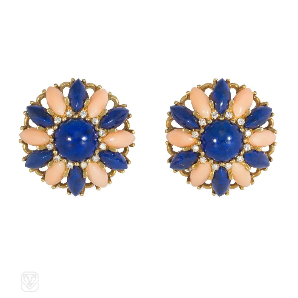 A pair of mid-century angel skin coral and lapis earrings designed as a stylized domed flower, with diamond accents in 18k gold. Italy. Maker's mark for F.O.S. di SANNAZZARO & C. Atw single cut diamonds 0.25 ct.