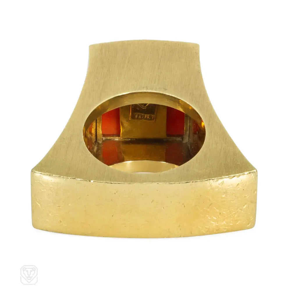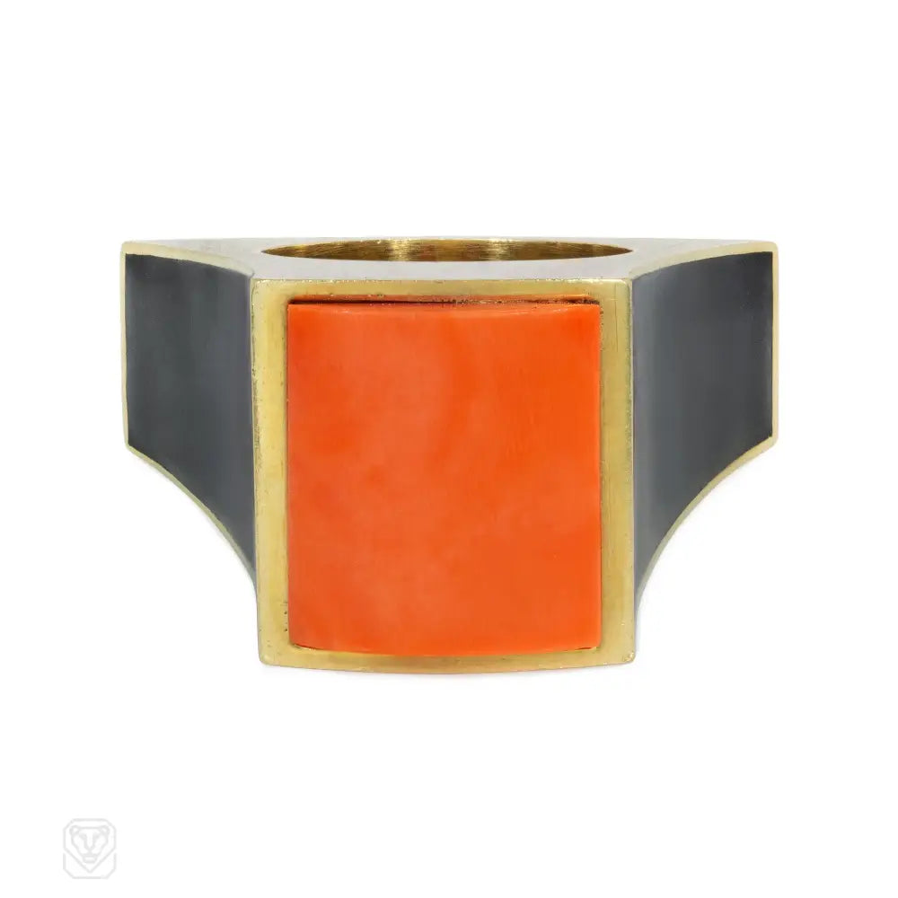 An abstract geometric gold ring centered by a rectangular coral plaque, with tapering, inset onyx shoulders, in 18k.
