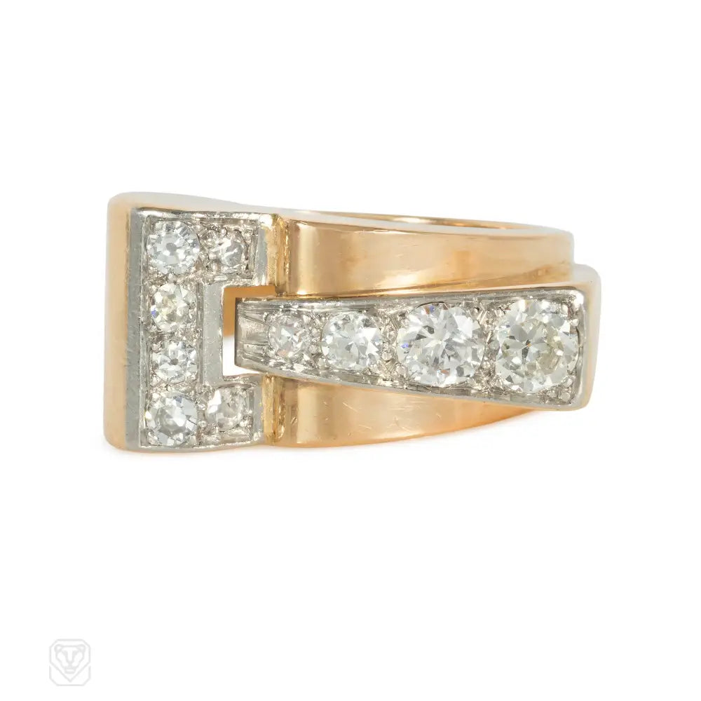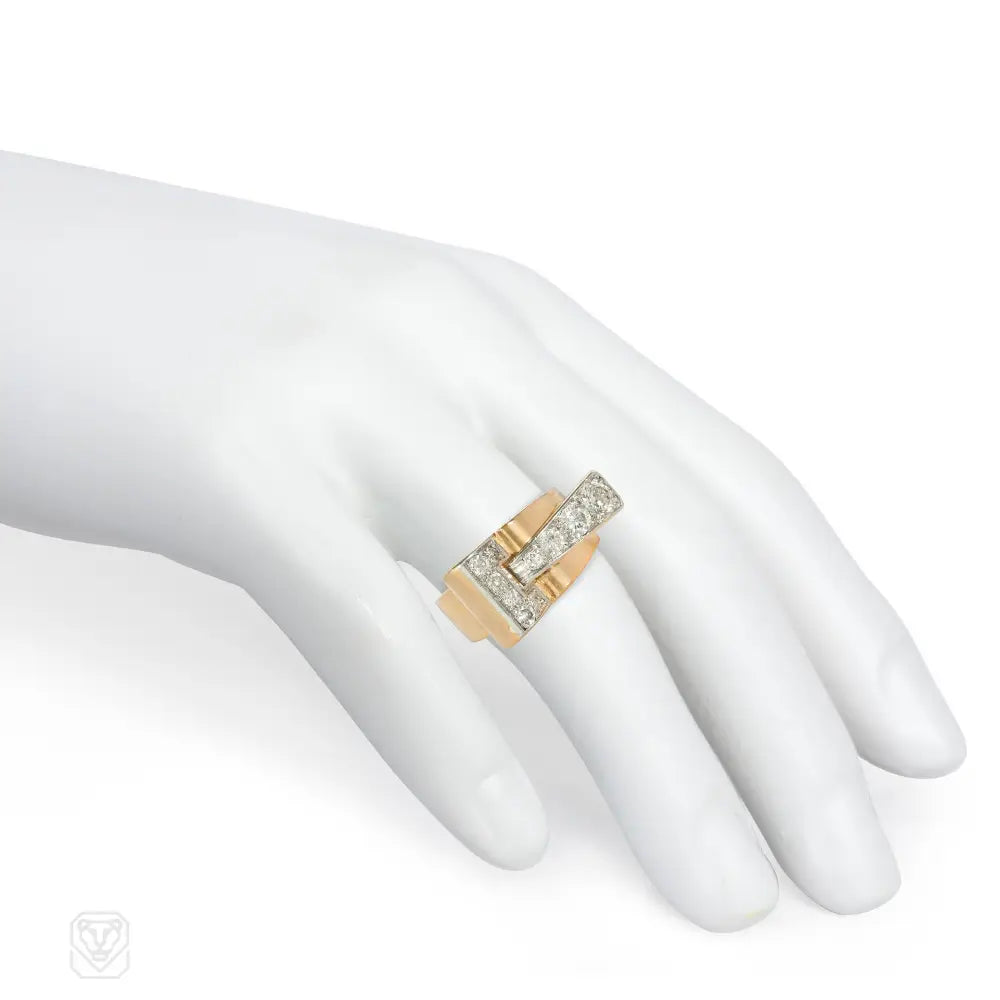 A Retro gold and diamond cocktail ring of stylized buckled design, in 14k. Atw diamonds .77 ct.