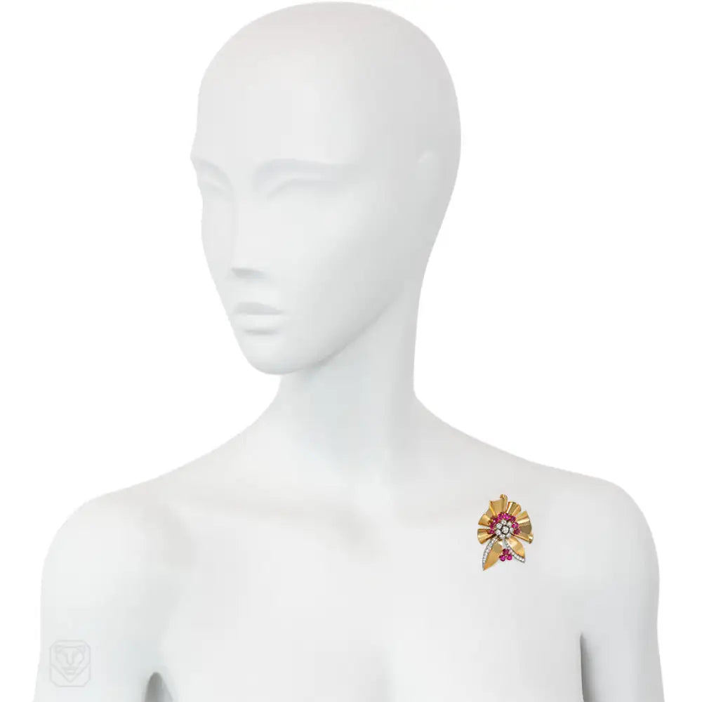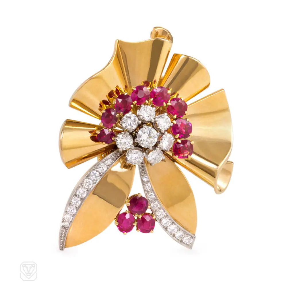 Mid-century gold, ruby and diamond brooch, Sasportas for Bailey Banks & Biddle