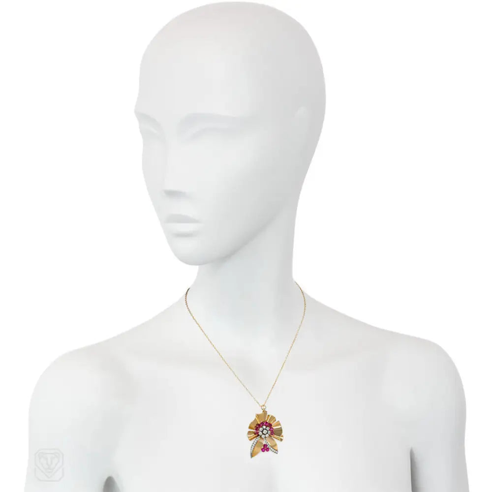 A mid-century ruby, diamond, and gold clip brooch in the form of a stylized flower, with pendant loop, in 18k. Sasportas, France; retailed by Bailey Banks & Biddle. #40485; #70730. Atw. 2.00 ct diamonds. (Chain not included)