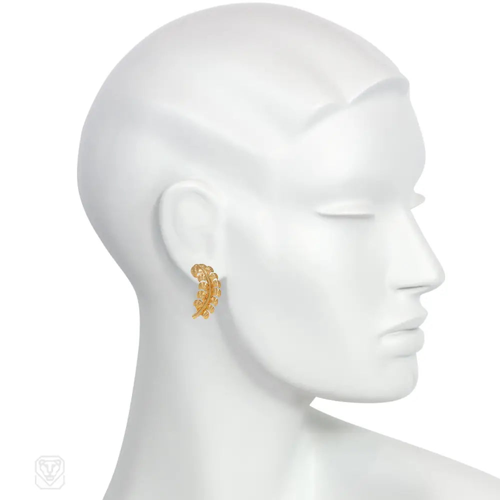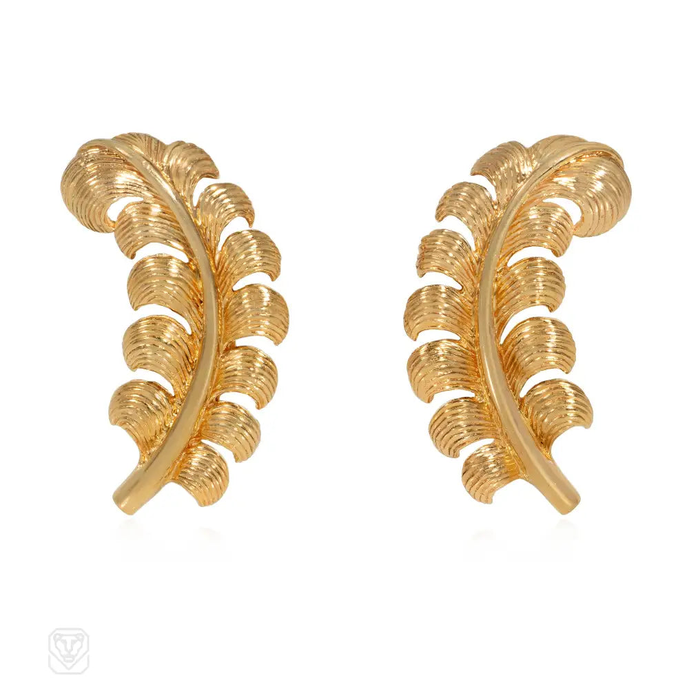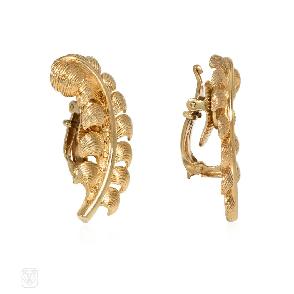 A pair of Retro gold earrings in the form of wind-swept fern leaves, in 14k. Tiffany & Co. With patent number for George Schuler.