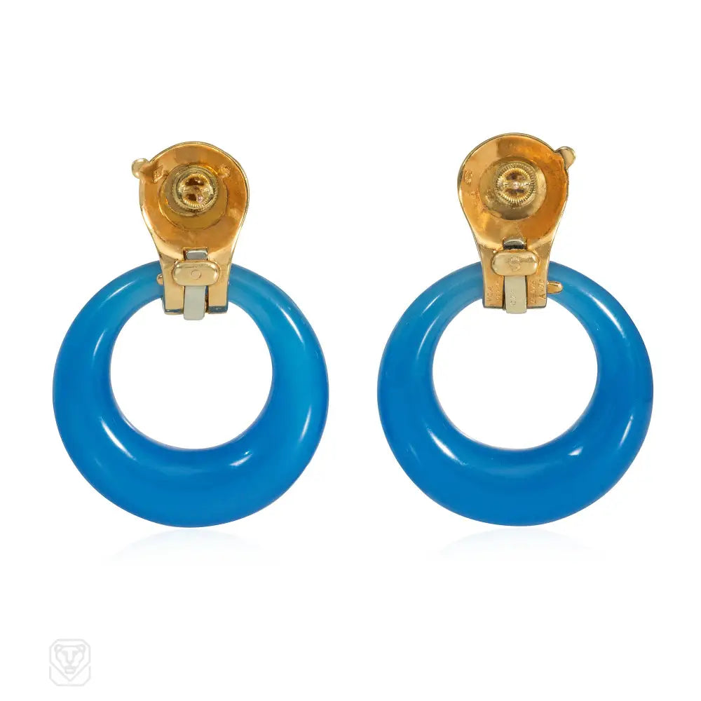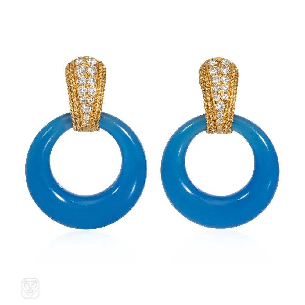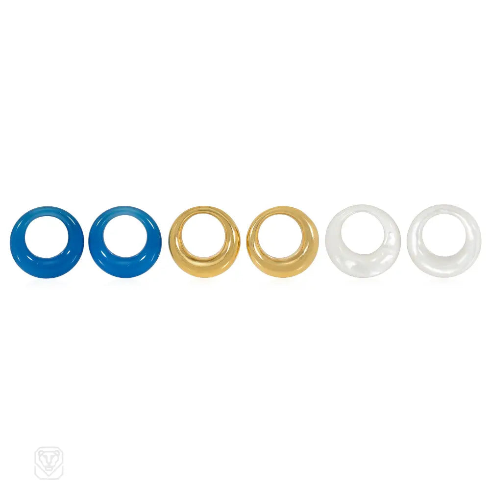 A pair of Mid-Century gold and diamond interchangeable doorknocker hoop earrings featuring gold, mother-of-pearl, and blue chalcedony inserts, in 18k with clip backs. Van Cleef & Arpels, France. Marked B3105 A470 C77 on clip backs, and B3015 Z306 C77 on gold hoops. With maker's poinçon for Pery et Fils. Atw diamonds .93 ct.