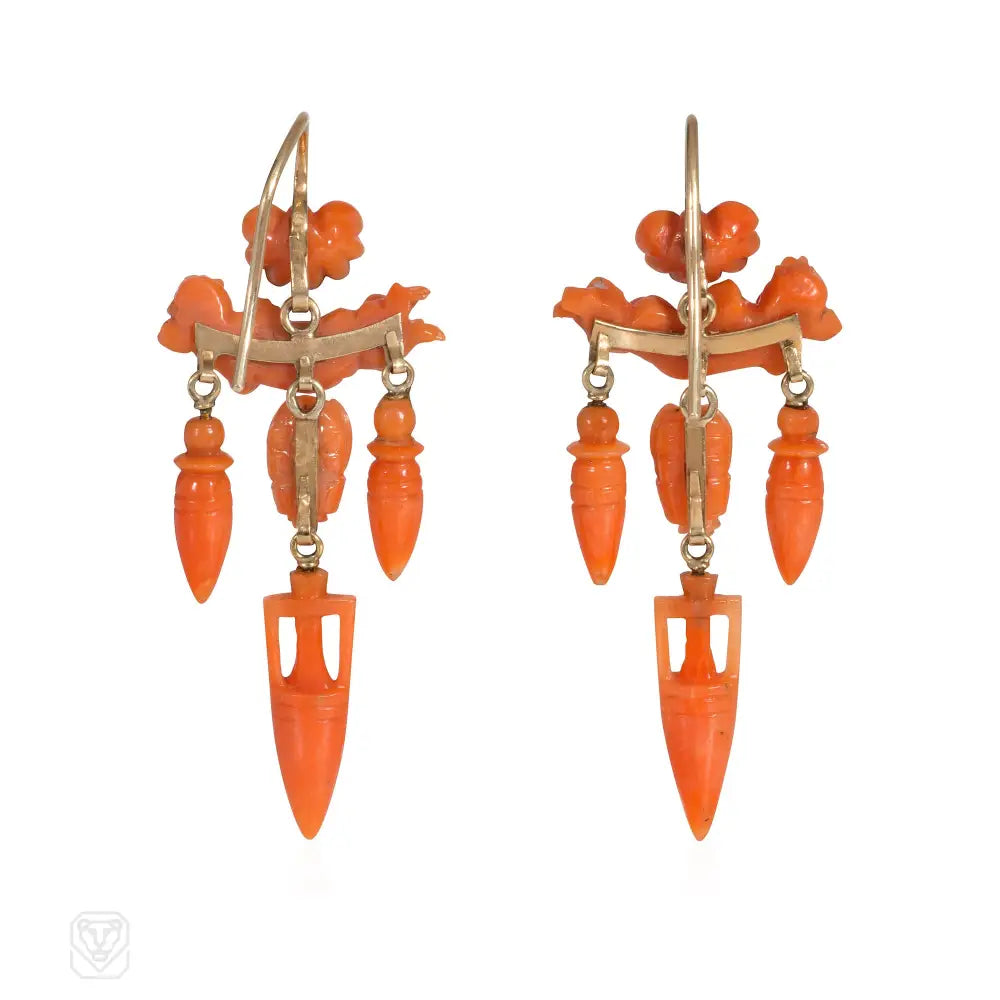 A pair of antique gold girandole earrings comprised of carved coral reclining cherubs suspending a scarab and three amphorae, with shell surmounts, in 15k. England