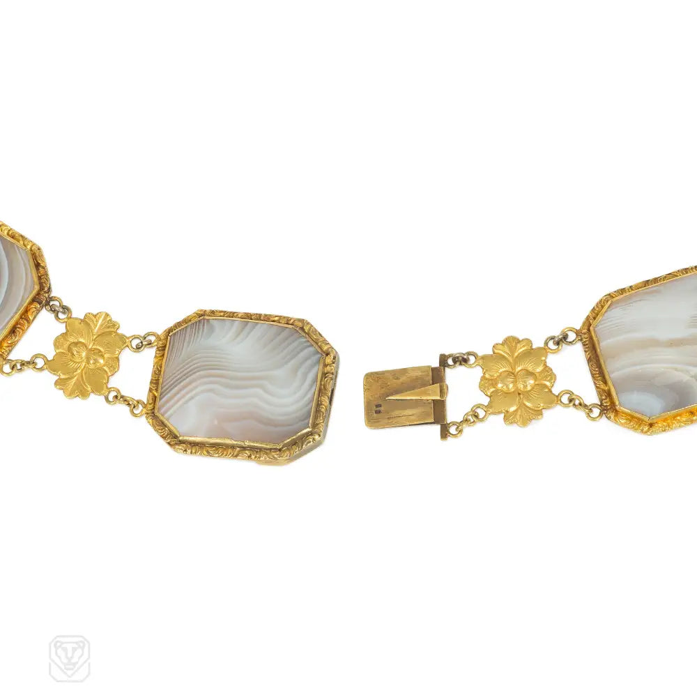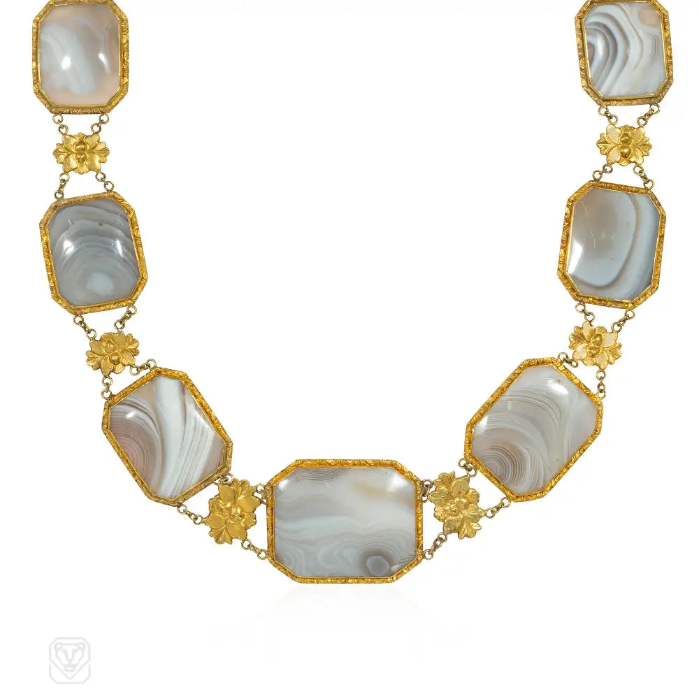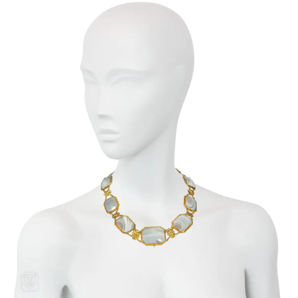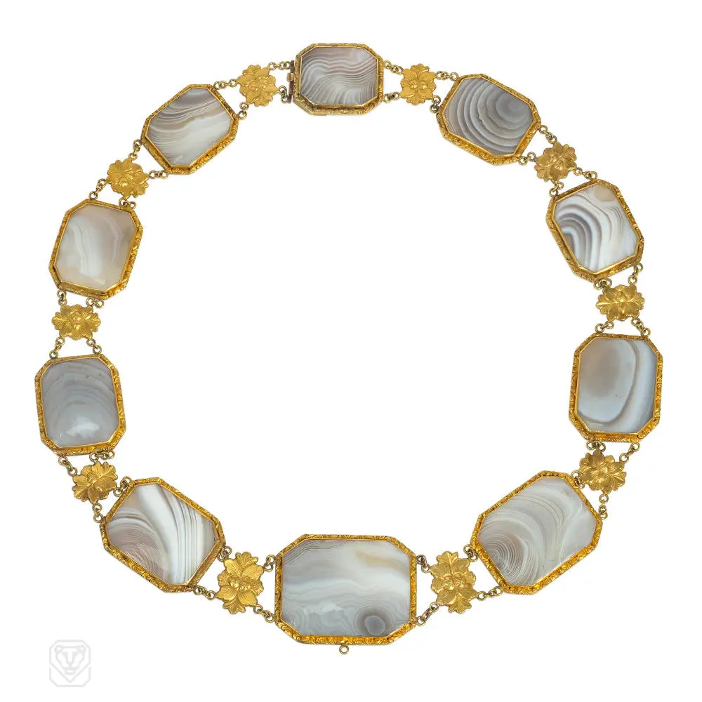 An antique gold necklace comprised of graduated octagonal agate plaques with carved gold surrounds and foliate spacers, in 18k. French import.