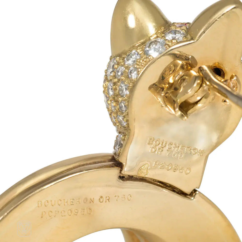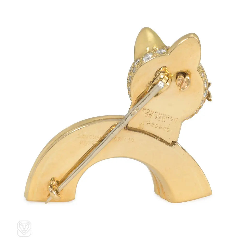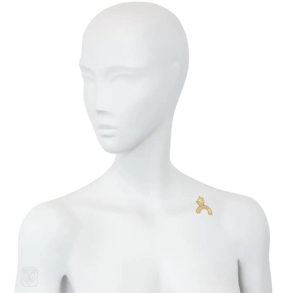 A Mid-Century gold, diamond, and enamel brooch in the form of a cat, with a curved and ribbed body, in 18k and platinum. Atw diamonds 1.50 cts. Boucheron, France.