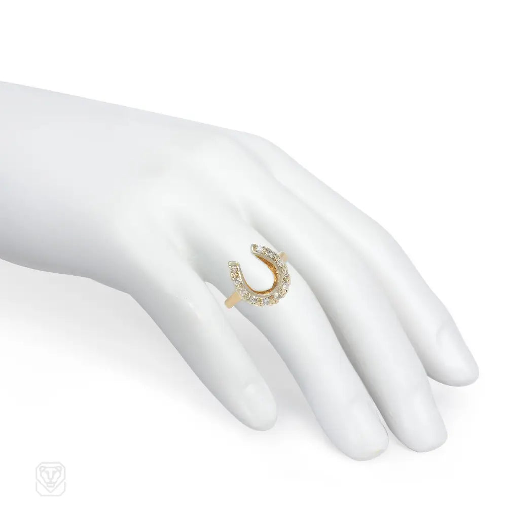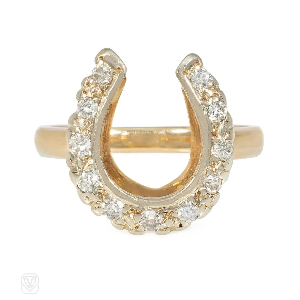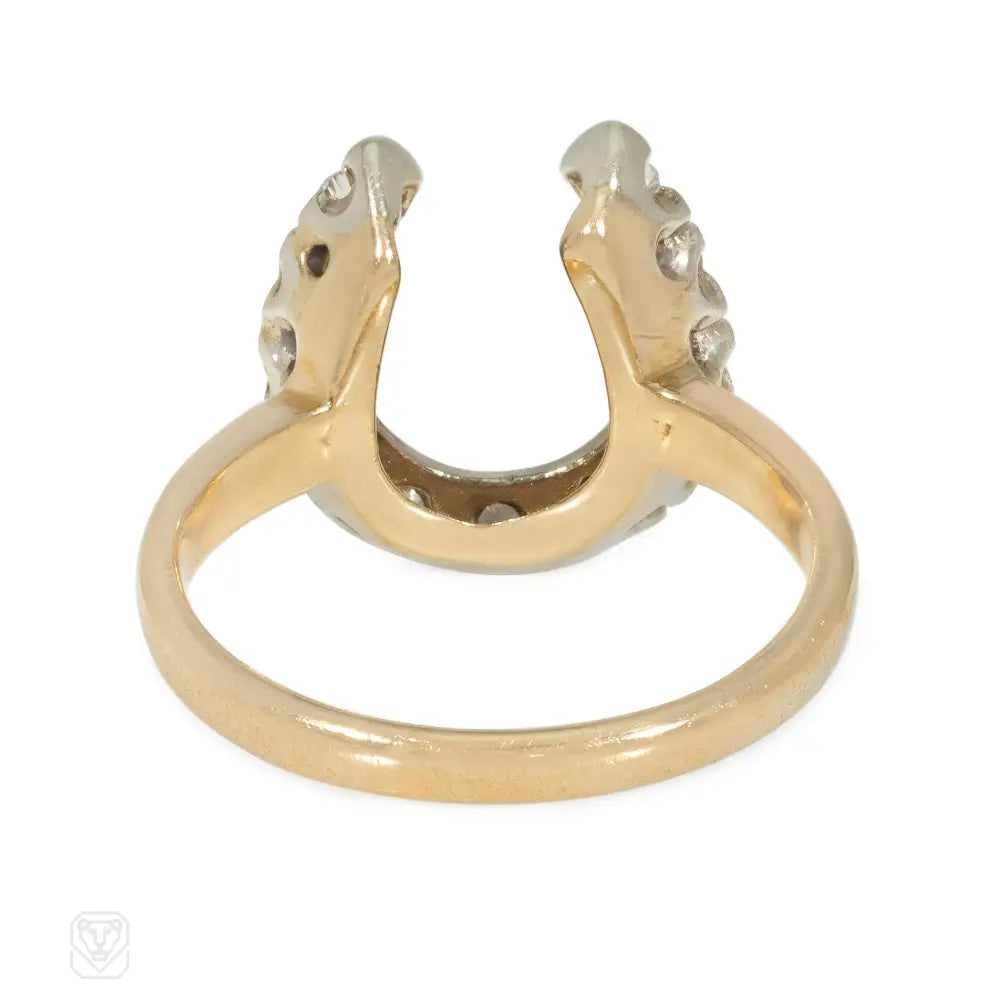 A Mid-Century gold and diamond ring in the form of a horseshoe, in 14k and platinum. Atw diamonds .25 ct.
