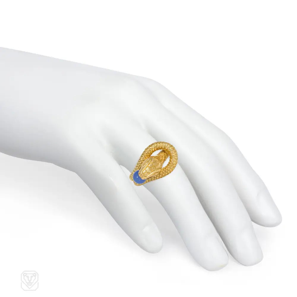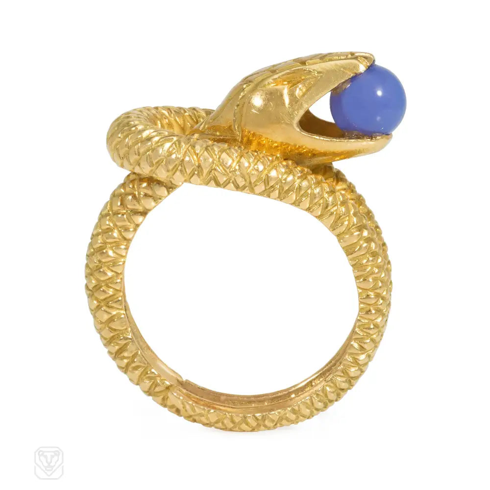 A gold ring in the form of an entwined serpent grasping a chalcedony bead in its jaws, in 18k. France