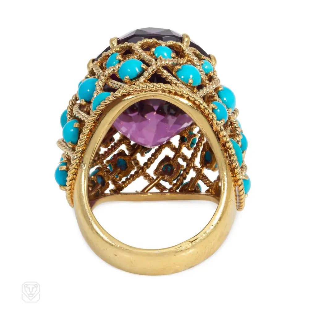 A Mid-Century amethyst, turquoise, and gold cocktail ring, centered by a large oval amethyst, set in an open-work, basket-weave mount set with cabochon turquoise, in 18k. French import.