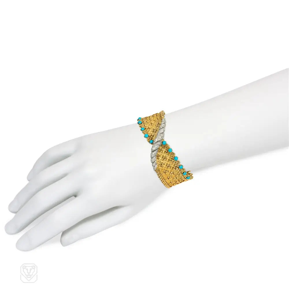 A Mid-century Polonais relief bracelet of woven and pressed gold with opposed and serrated turquoise borders and centering on a a twisted diamond element, in 18k and platinum. Atw diamonds 1.00 ct. Georges Lenfant, Paris. #7177769