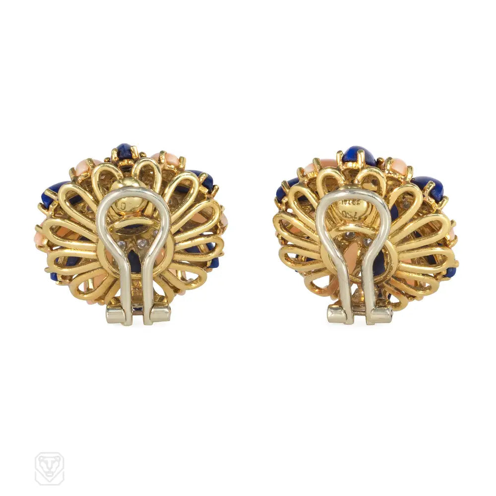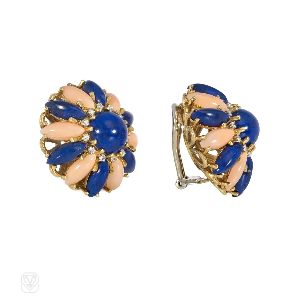A pair of mid-century angel skin coral and lapis earrings designed as a stylized domed flower, with diamond accents in 18k gold. Italy. Maker's mark for F.O.S. di SANNAZZARO & C. Atw single cut diamonds 0.25 ct.