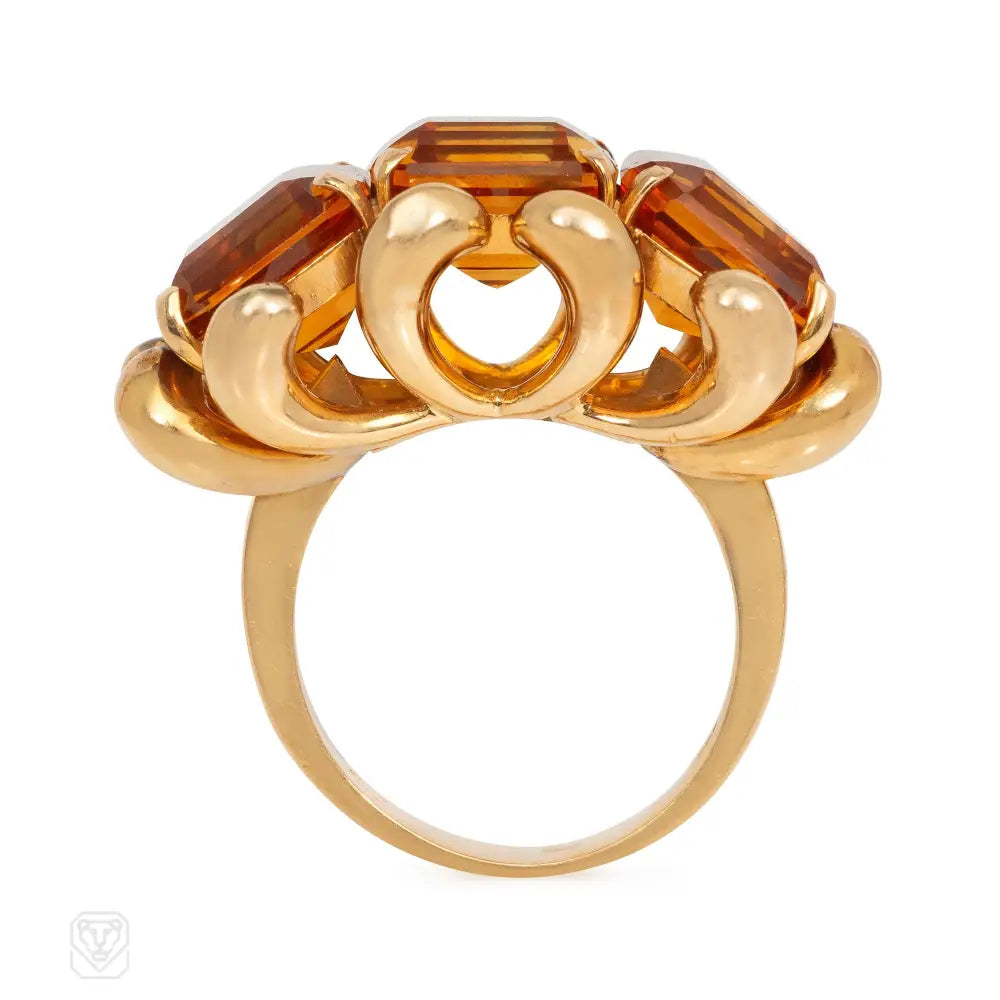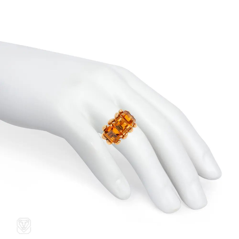 A Mid-Century citrine and rose gold cocktail ring, centered by three, emerald-cut citrines in a sculptural, lobed mount, in 18k. France