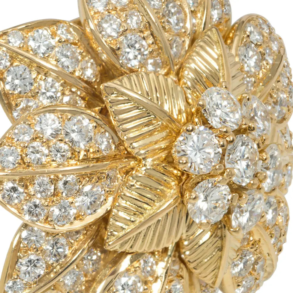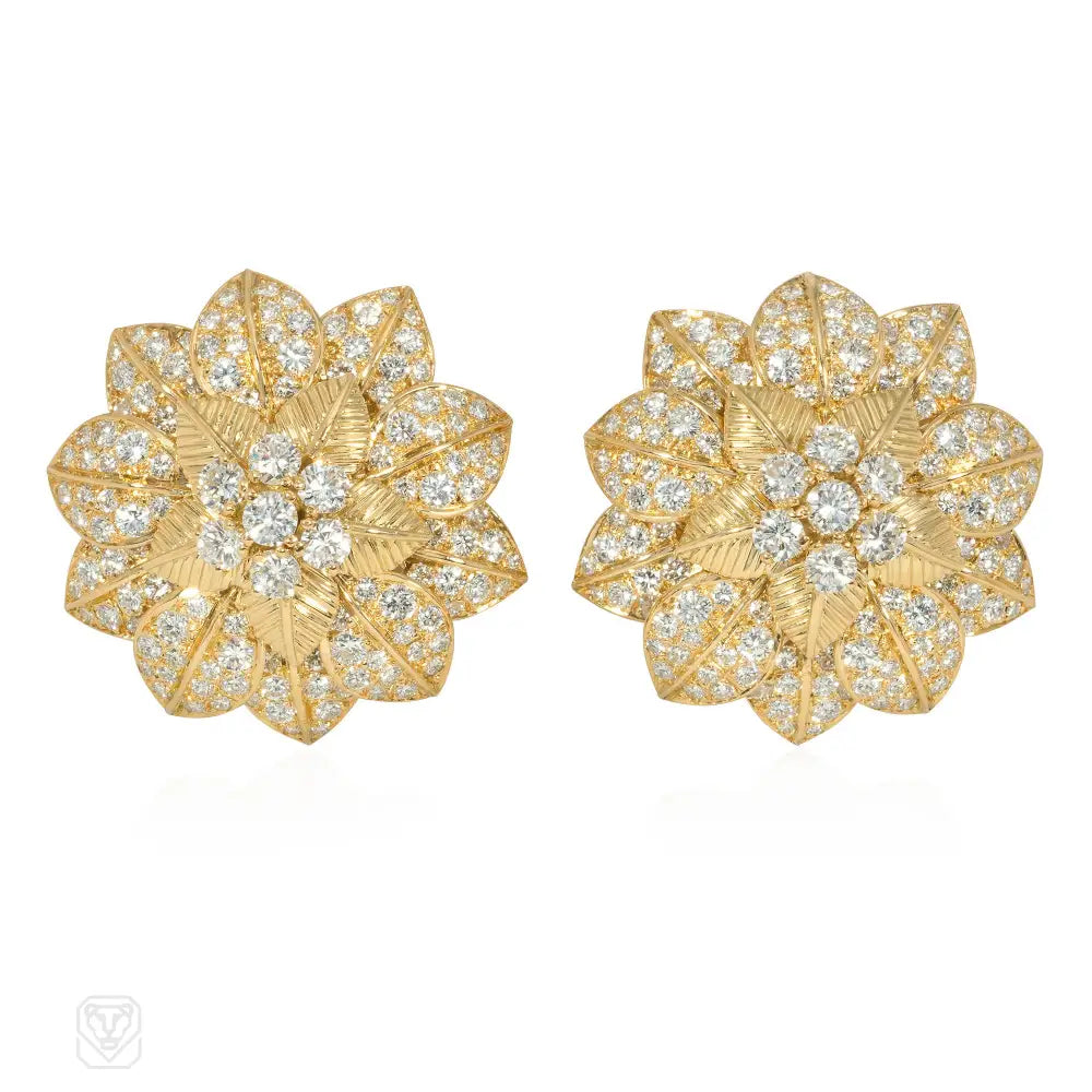 A pair of Mid-Century diamond and gold clip earrings in the form of flowers centered by diamond clusters in textured gold petals, and further surrounded by diamond-set petals, in 18k. Van Cleef & Arpels, France. #M39112. Atw 10.50 cts.