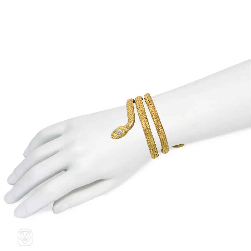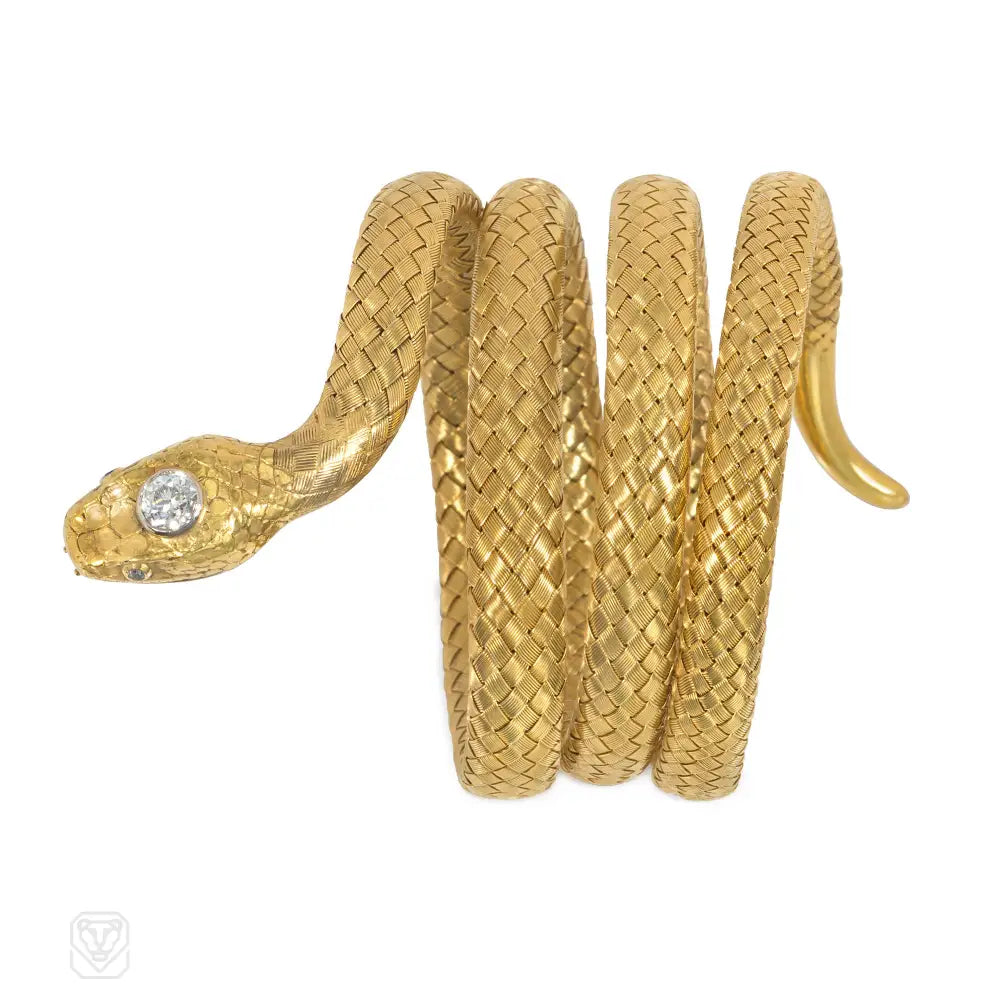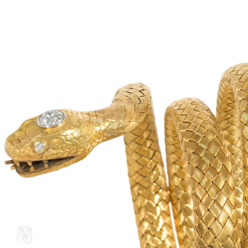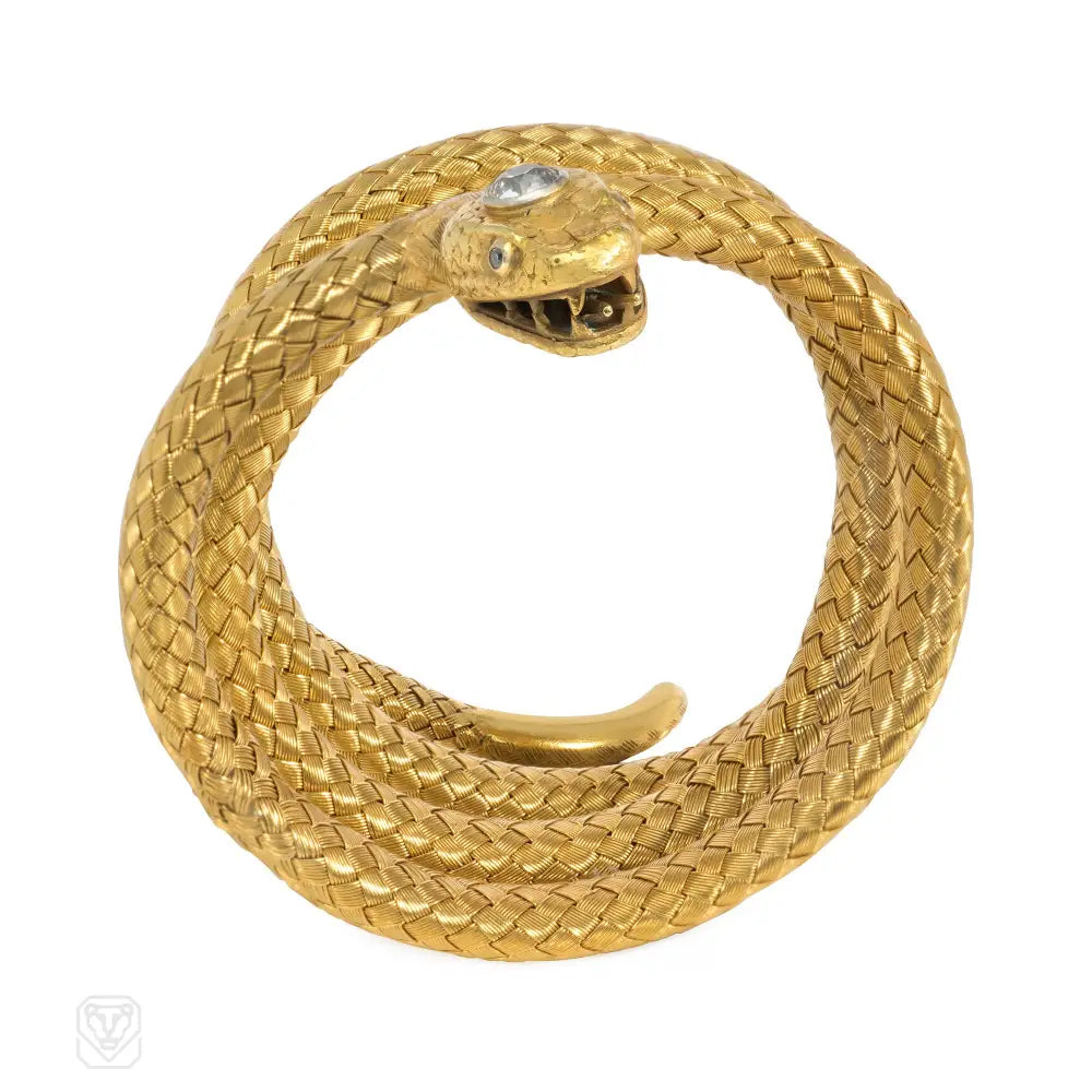 A Victorian woven gold bangle in the form of a coiled serpent with a diamond-set head, in 18k. Atw diamonds .27 ct.