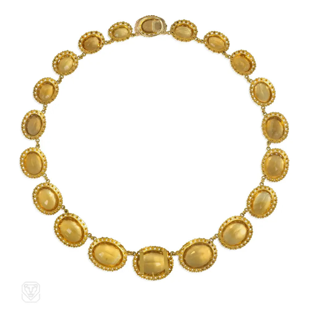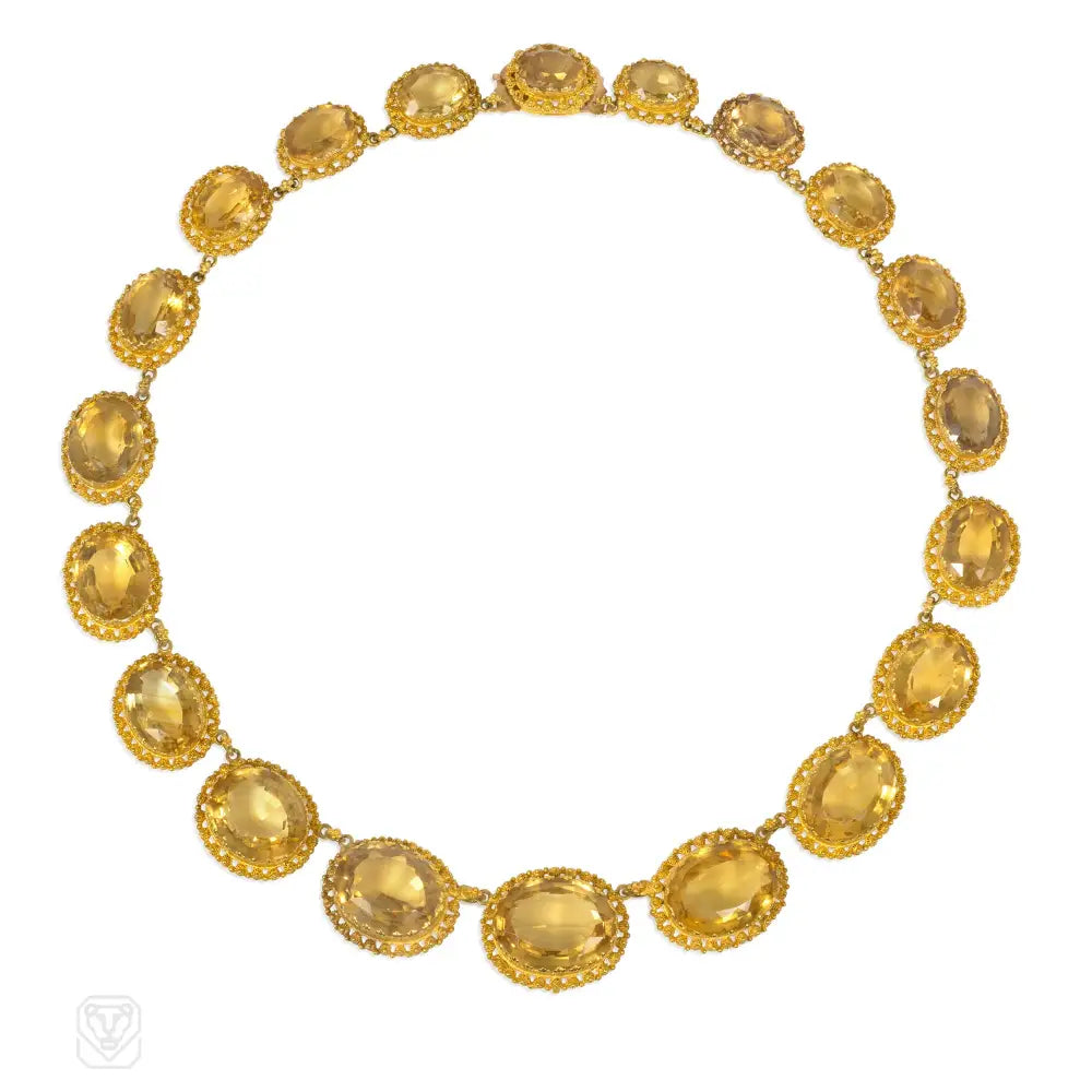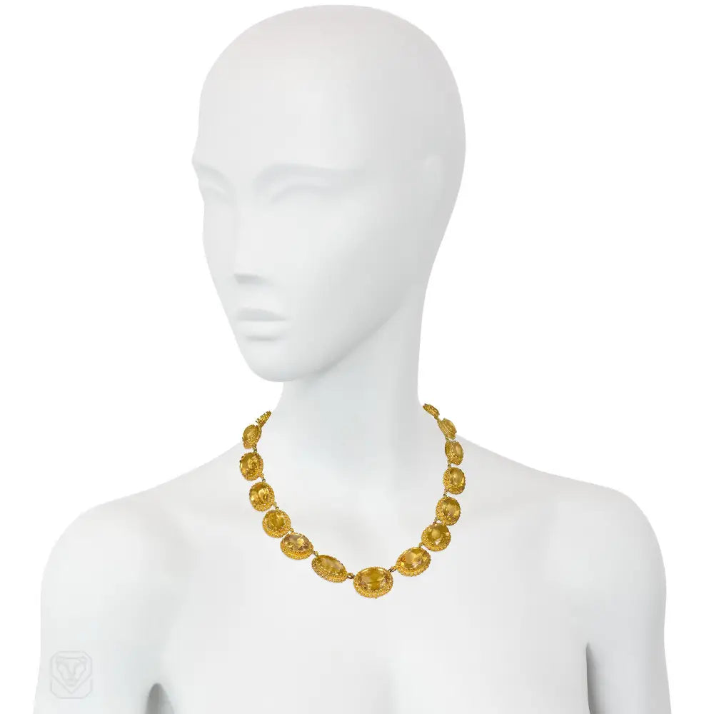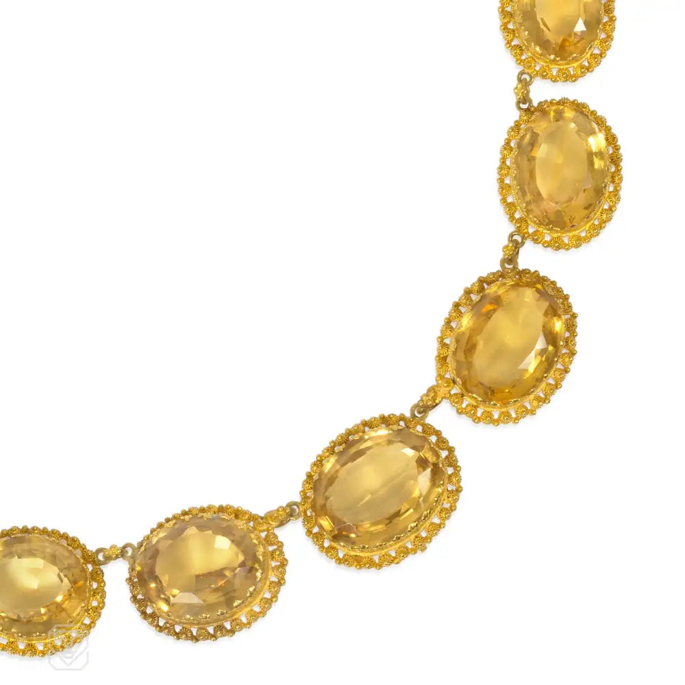 A Victorian graduated rivière necklace comprised of oval citrines in cannetille surrounds, in 18k. Central bulla detaches to be worn as a choker or pendant.