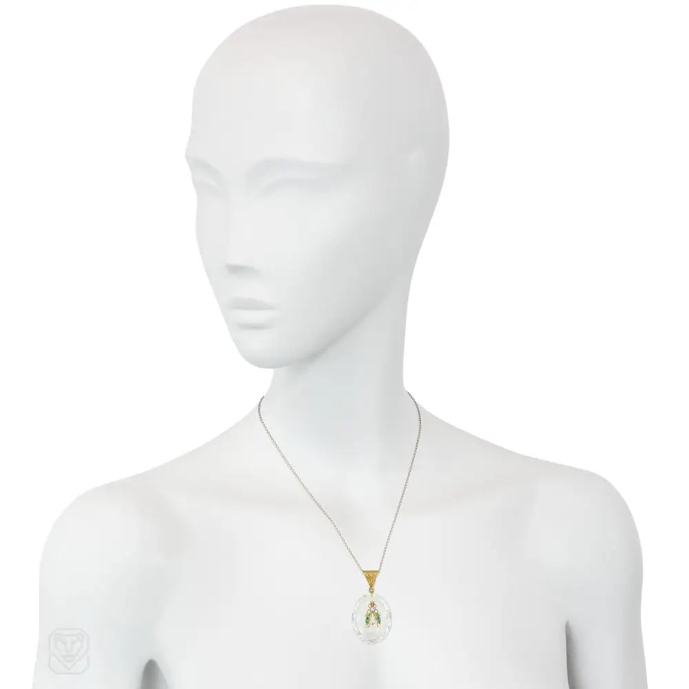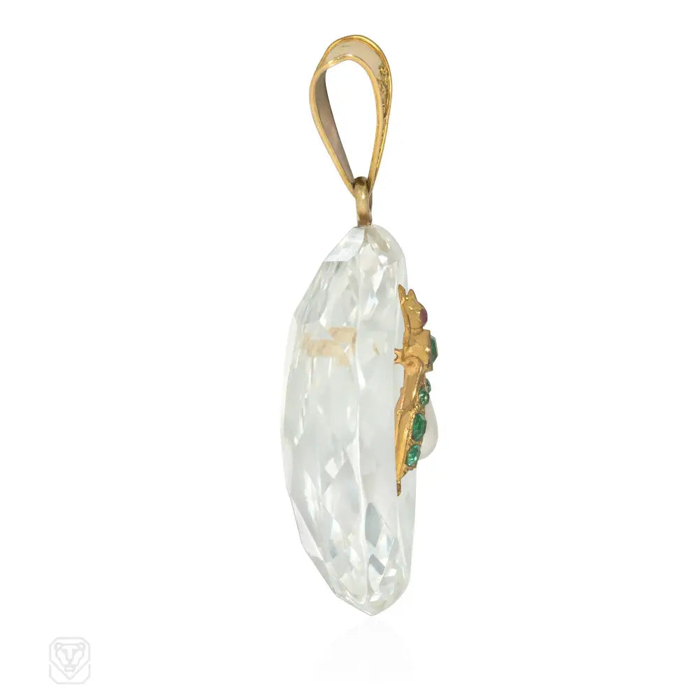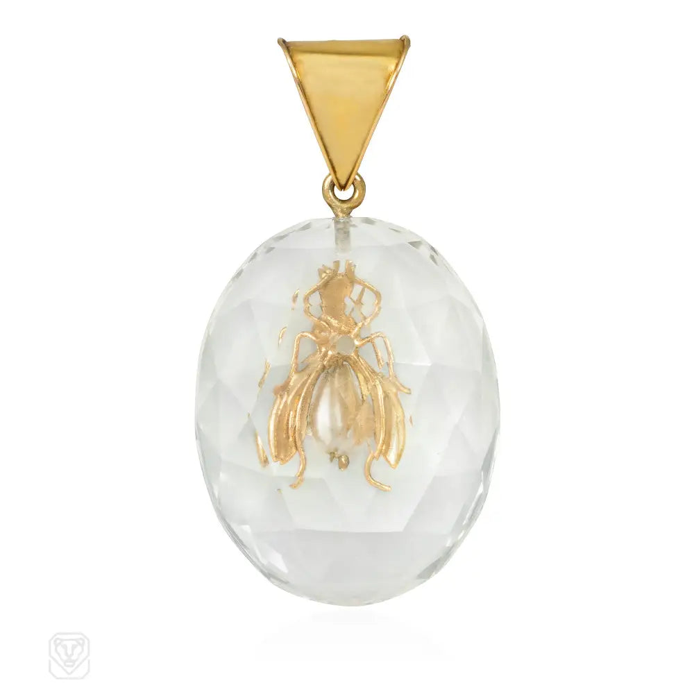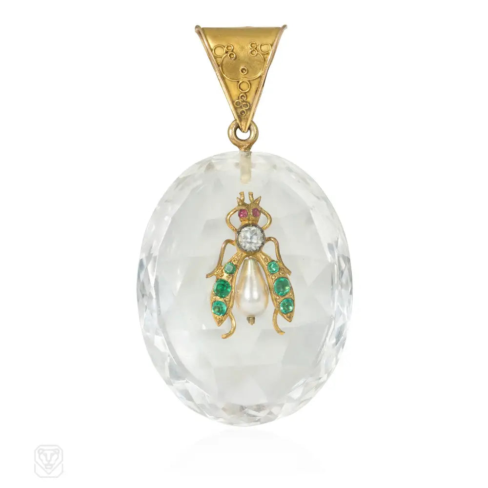 A Victorian carved rock crystal pendant centered by a paste set fly with a wirework embellished tapered gold bale, 15k. England