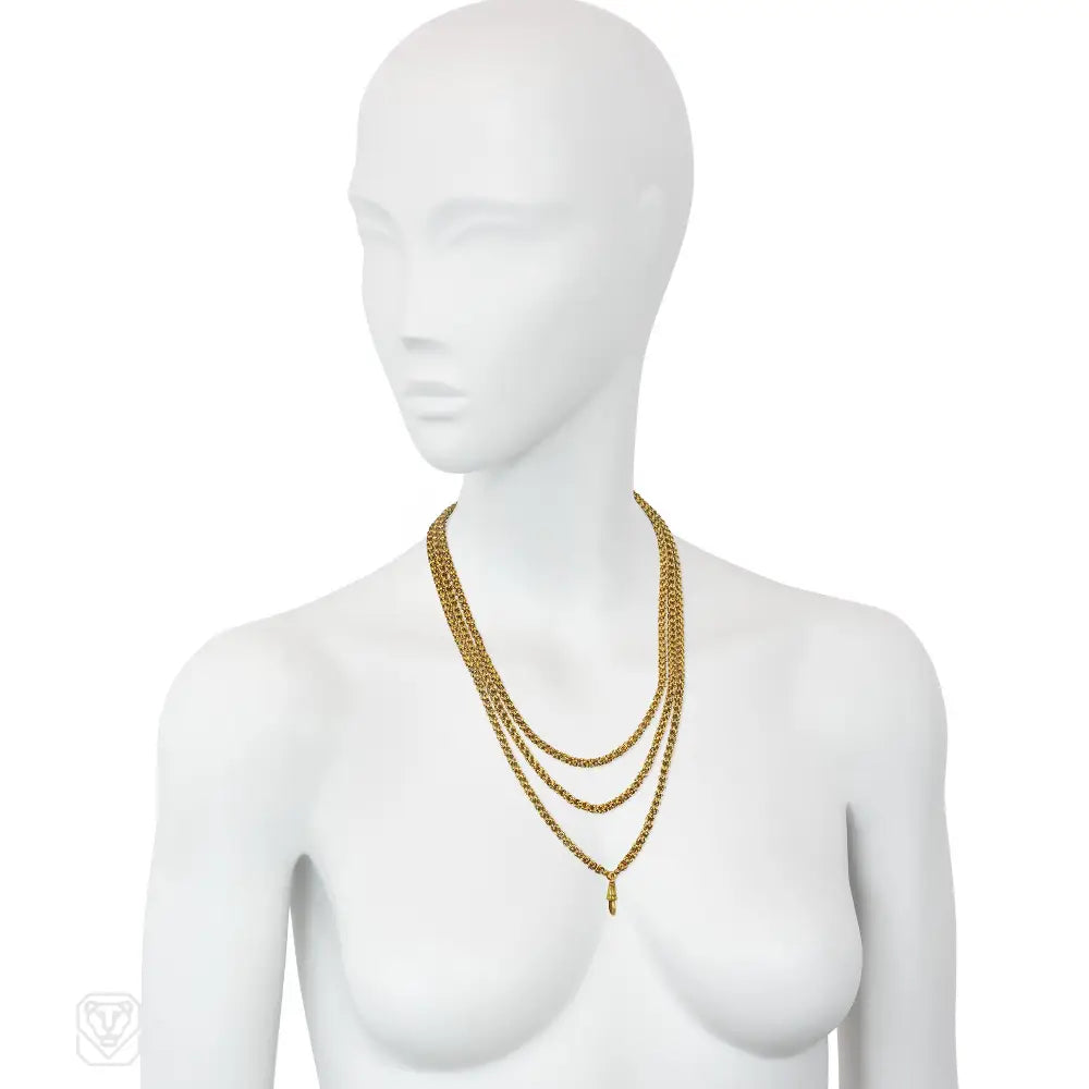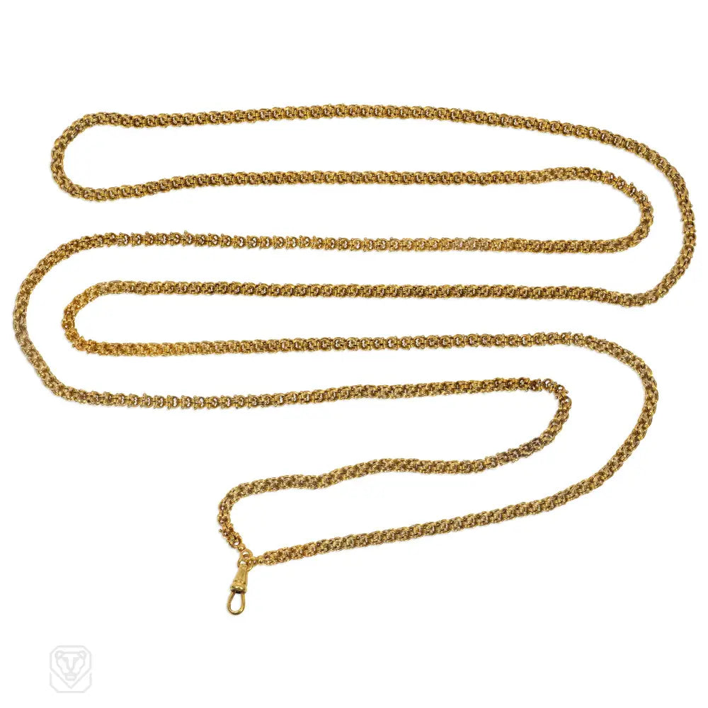 A Victorian gold long guard chain comprised of handmade, interlocking reeded and beaded links, in 15k. England (French swivel hinged bale in 18k)