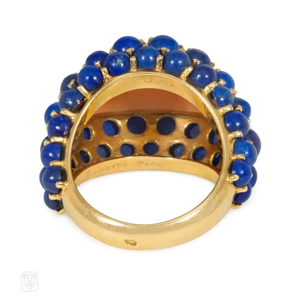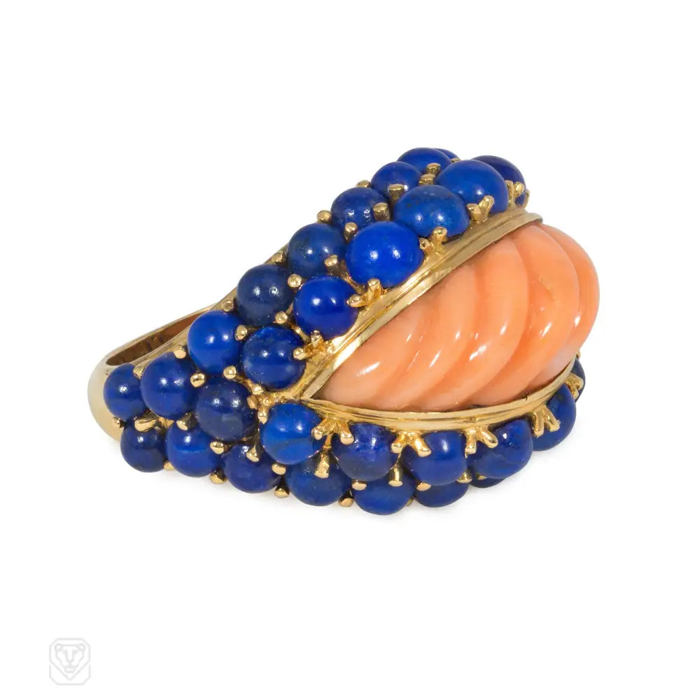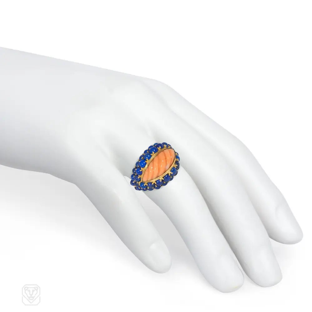 A Mid-Century bombé style ring comprised of navette-shaped, carved coral in cabochon lapis surround, in 18k gold. Boucheron, Paris. #49731