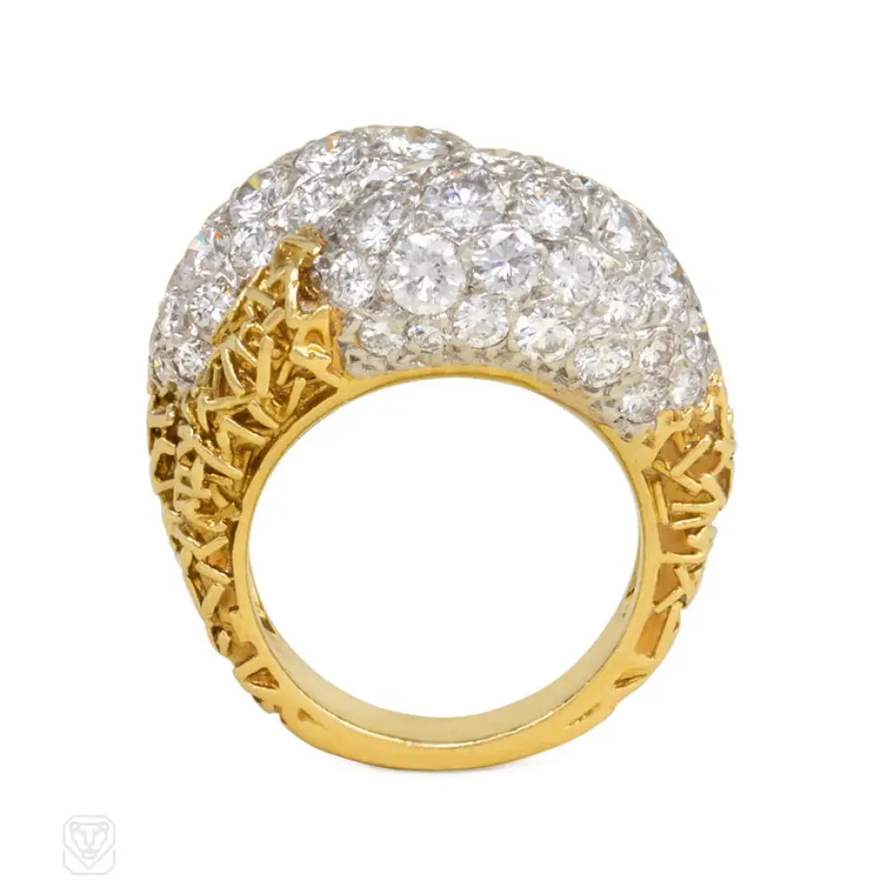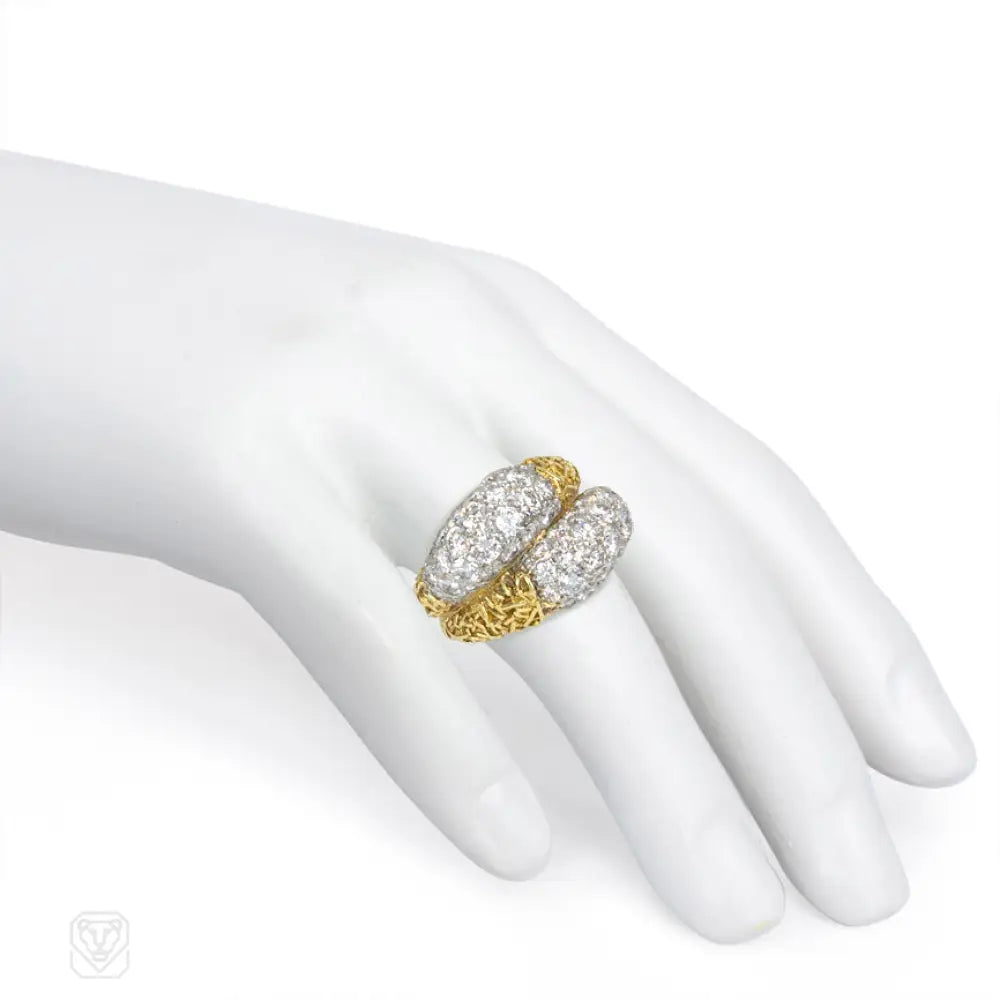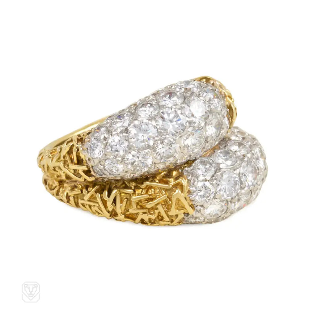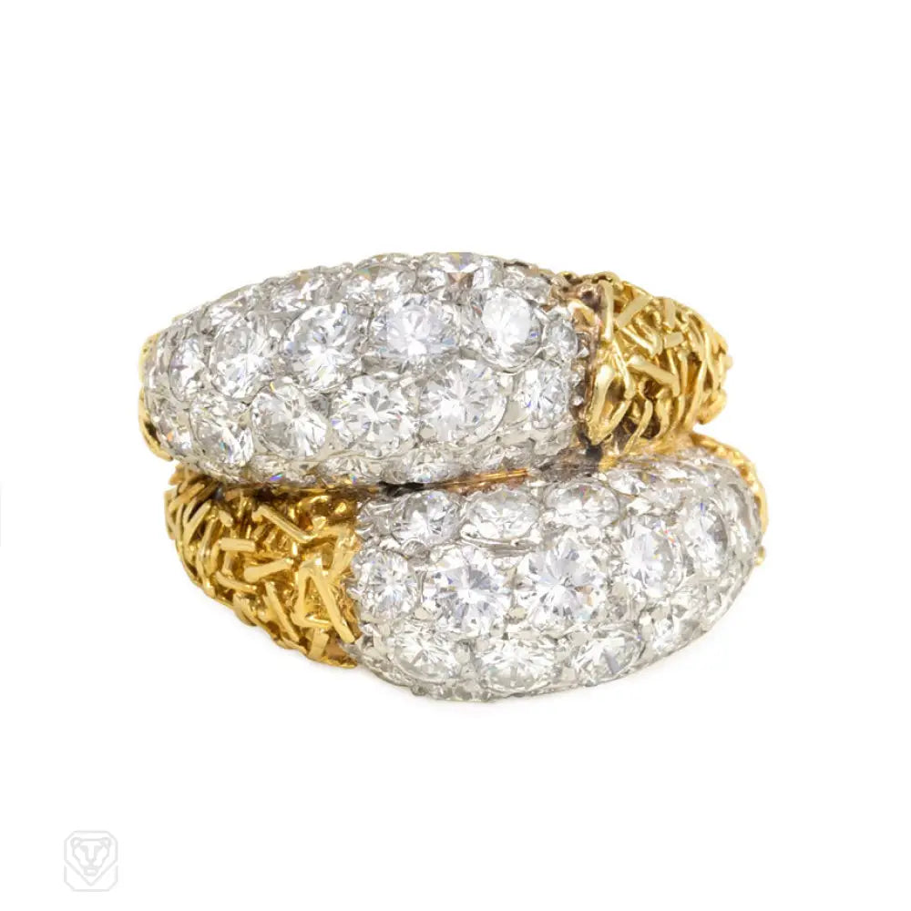 A textured gold and pavé diamond ring of double bombé bypass design, in 18k and platinum. Van Cleef & Arpels, France #22700. Atw 4.58 ct. diamonds.