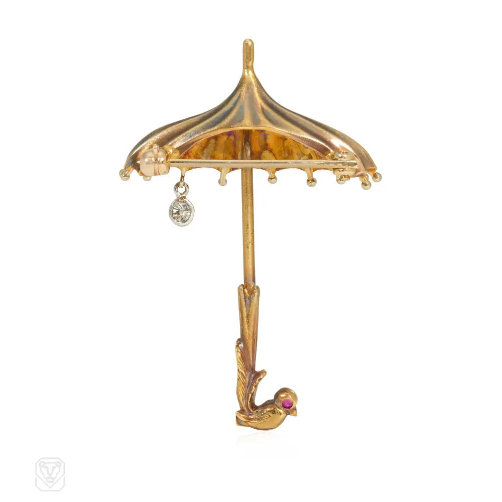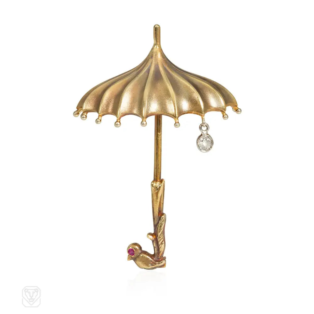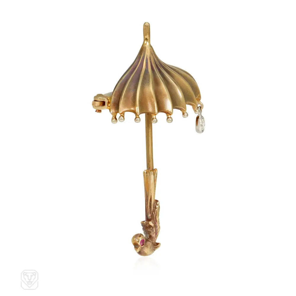 A Retro gold brooch designed as an umbrella with an articulated diamond raindrop and a bird-shaped handle, in 14k
