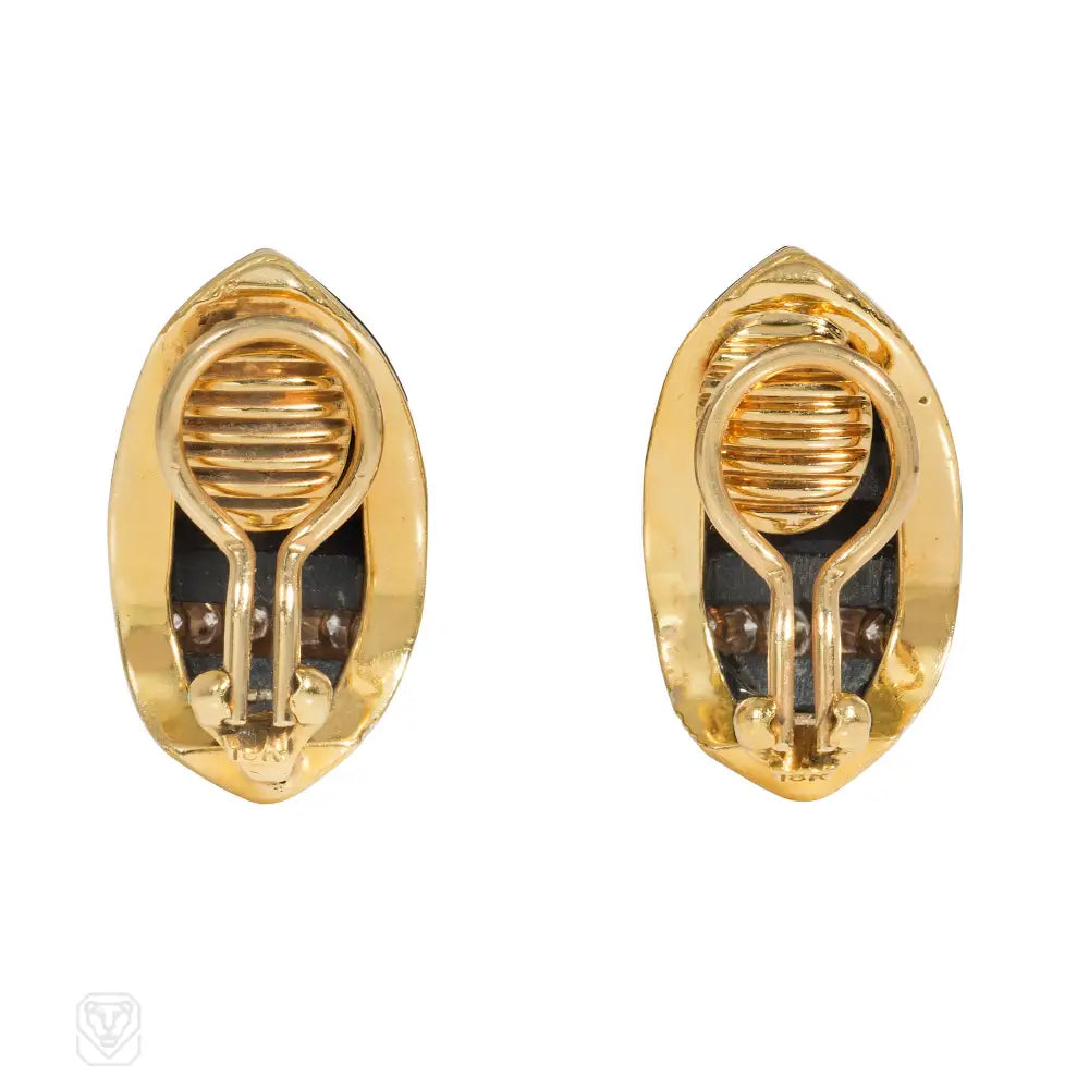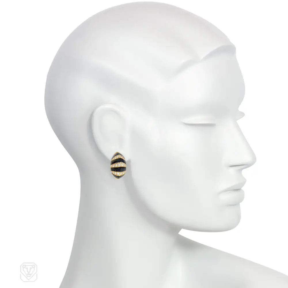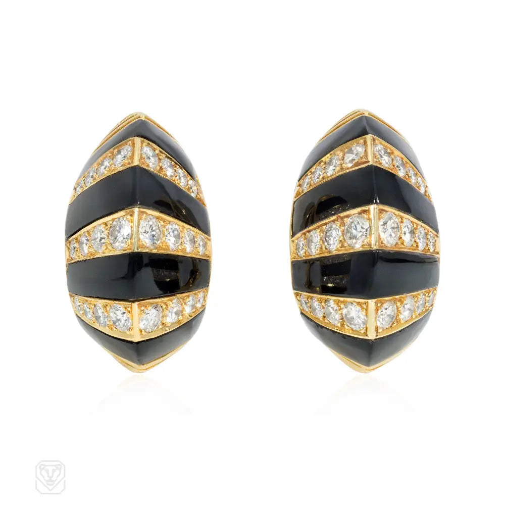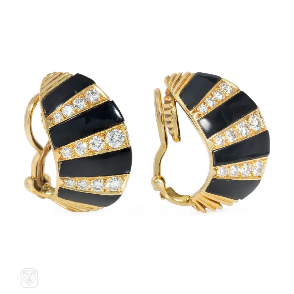 A pair of half hoop earrings of tapered and beveled design comprised of alternating segments of onyx and diamonds, in 18k gold. Atw diamonds 2.75 cts.