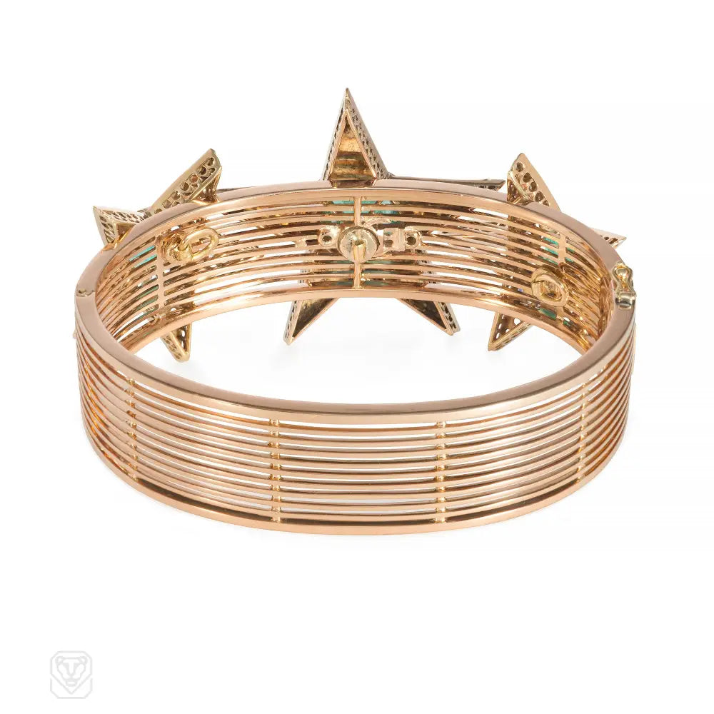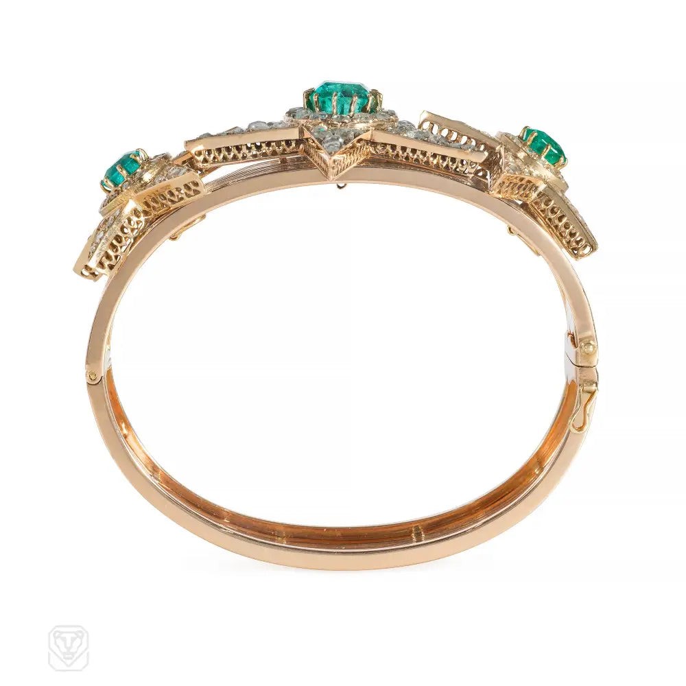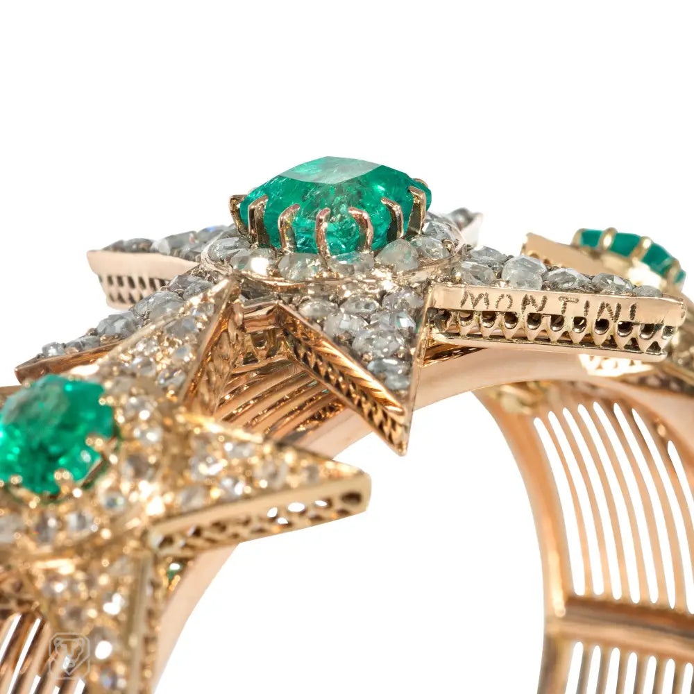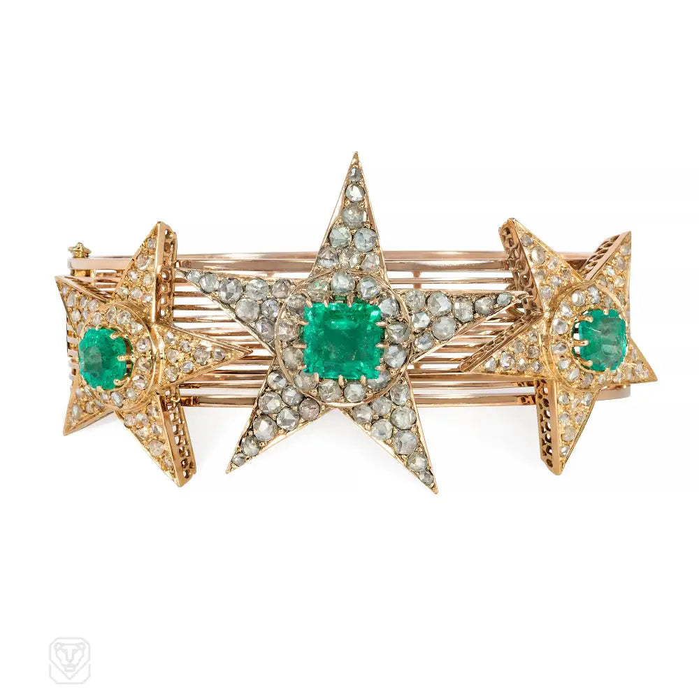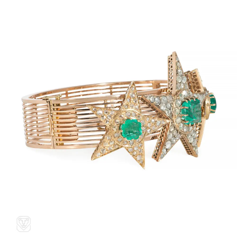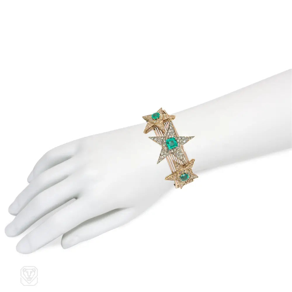 An antique emerald, diamond, and gold wirework cuff bracelet, adorned with three pavé rose-cut diamond stars centered by emeralds, in 18k.