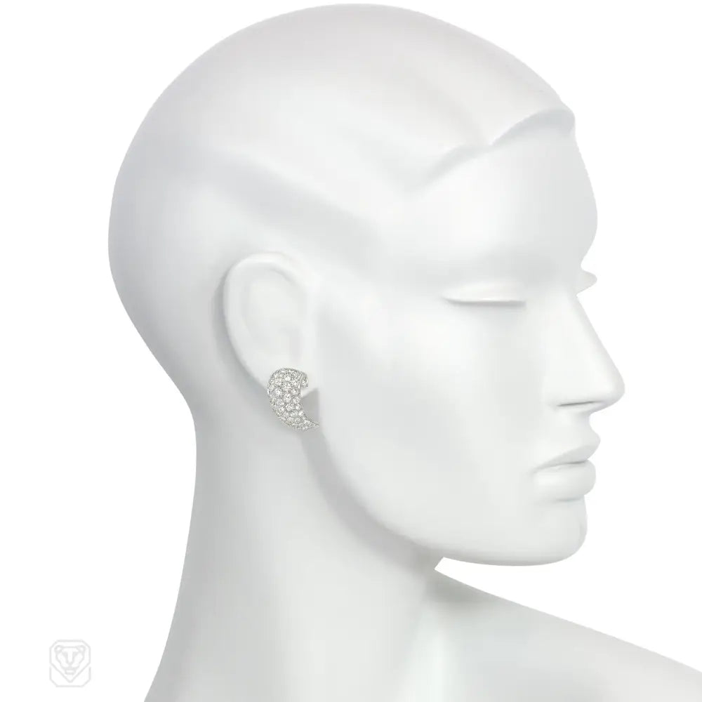 A pair of Retro pavé diamond earrings of scrolled crescent design, in platinum. Atw diamonds 2.50 cts.