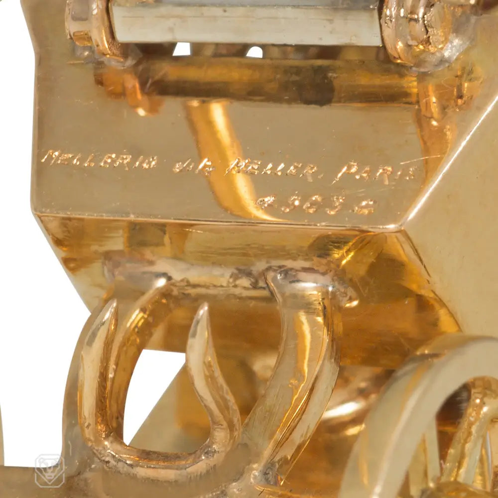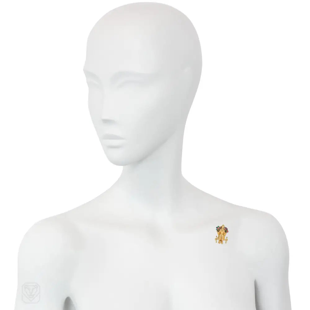 A Retro gold and multi-gem clip brooch in the form of a woman pushing a flower cart, set with sapphires, emeralds, and rubies, in 18k. Mellerio dits Meller. #49630. France.