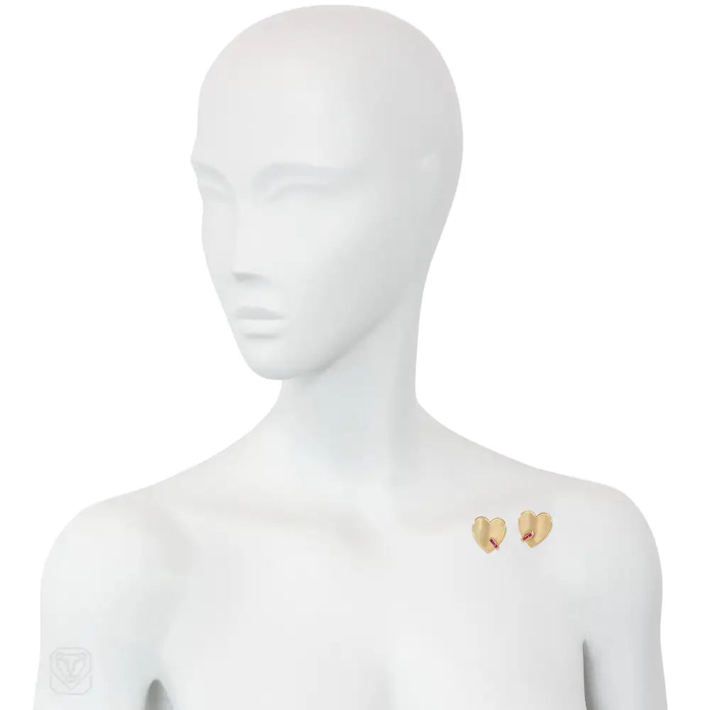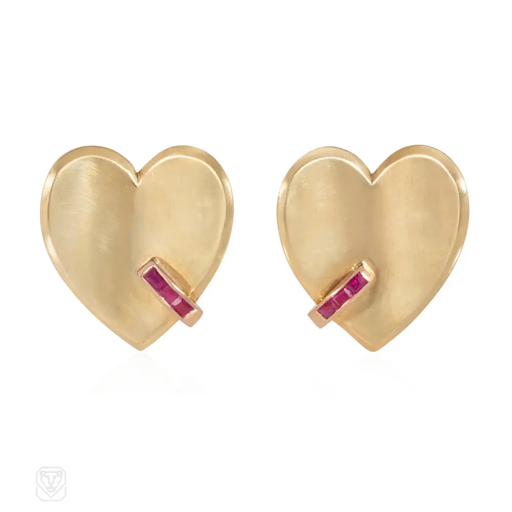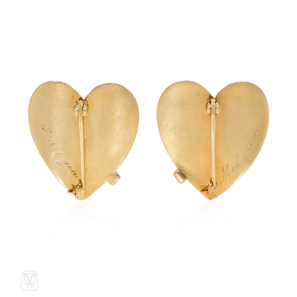 A pair of Retro gold brooches in the form of concave hearts with ruby embellishments, one brooch engraved "I love you" and the other "Mel, 1-16-46" in 14k. Attributed to Paul Flato.