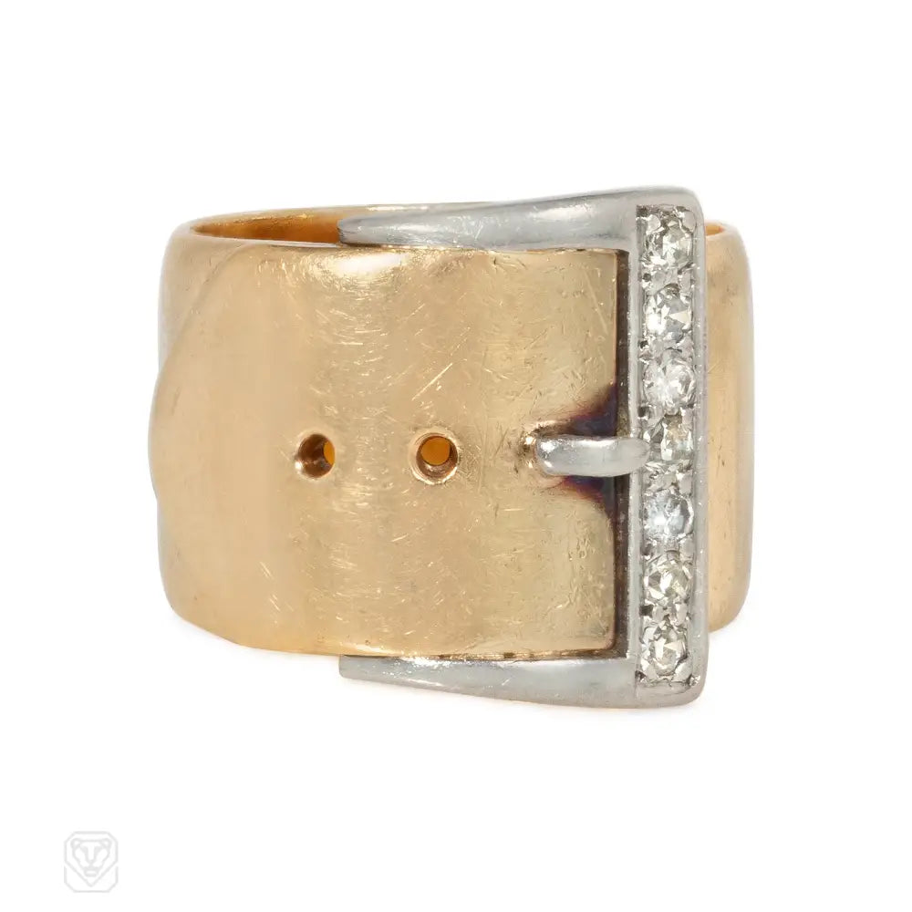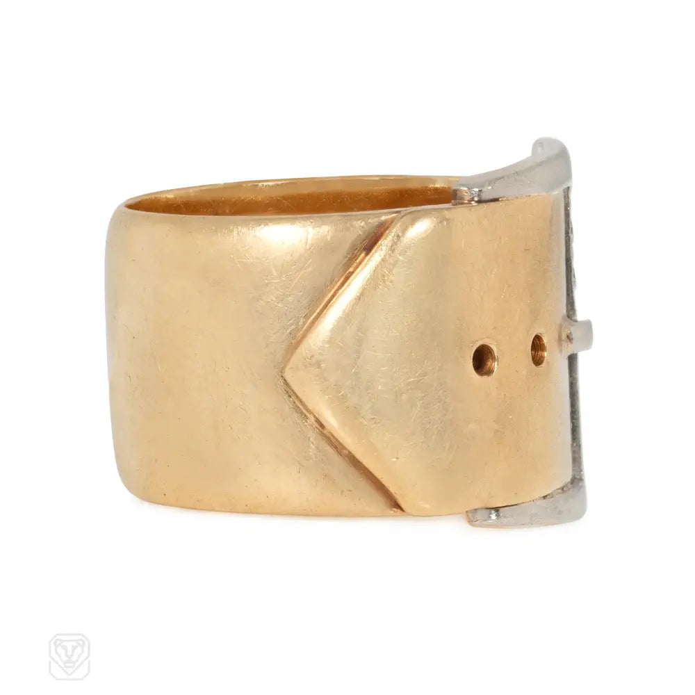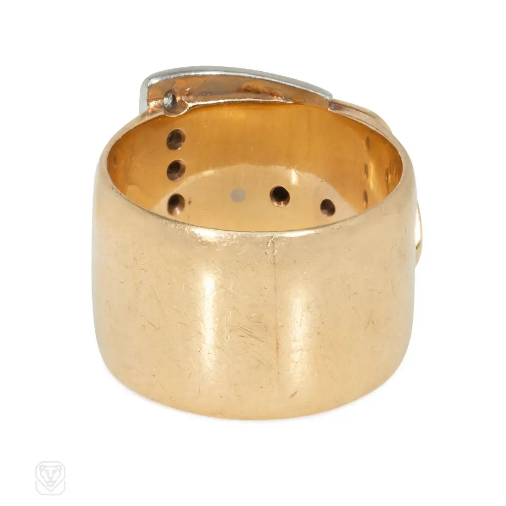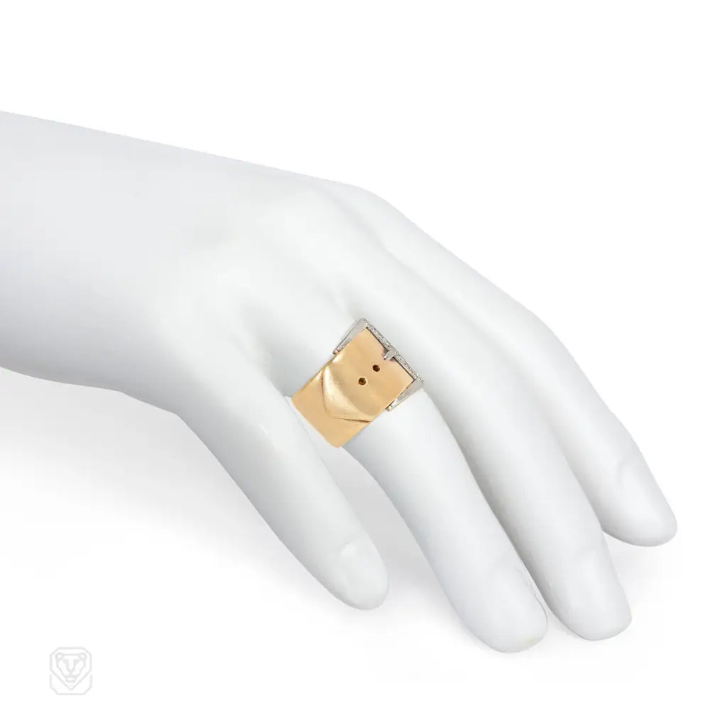A Retro gold and diamond ring of buckled design, in 14k and platinum. Atw diamonds .10 ct.