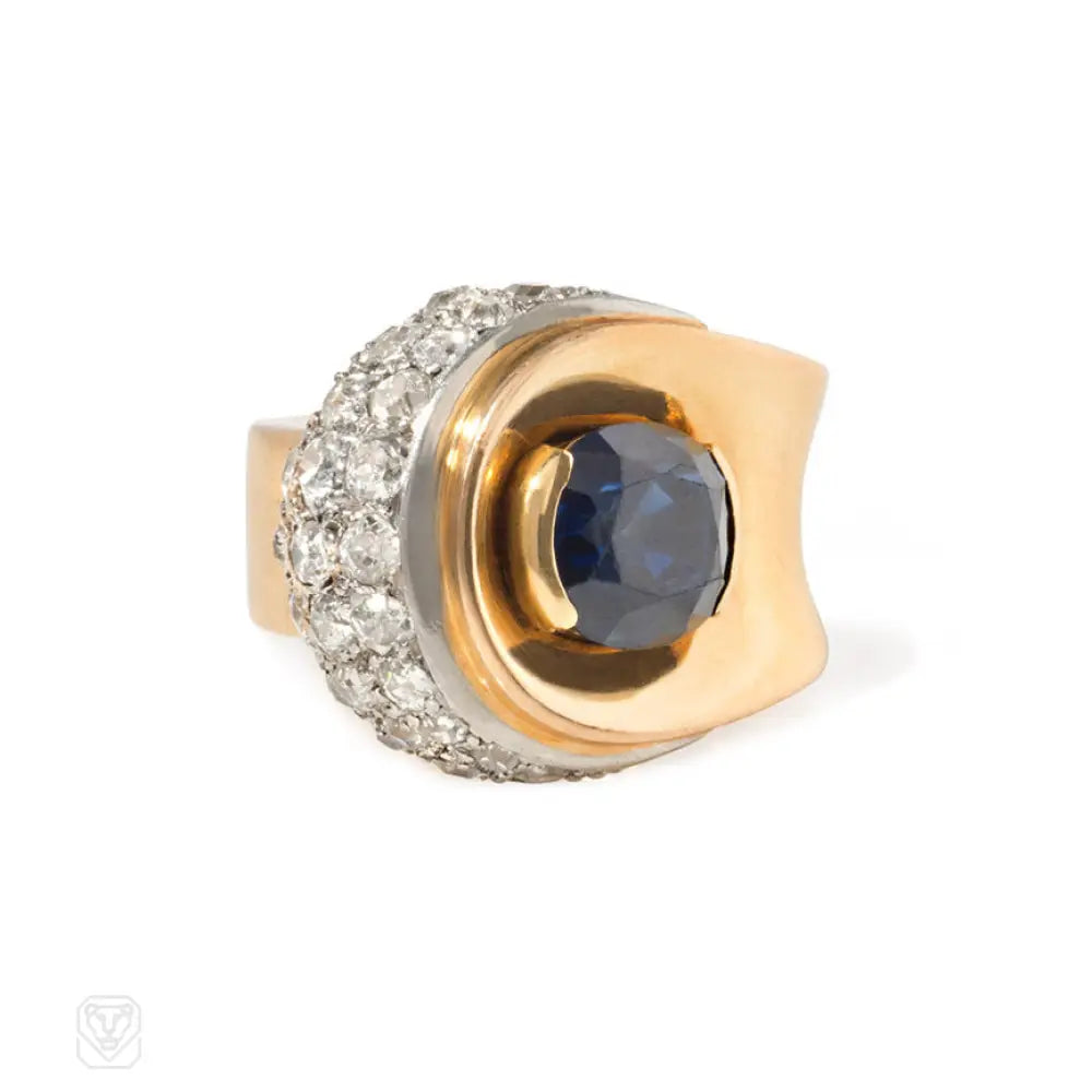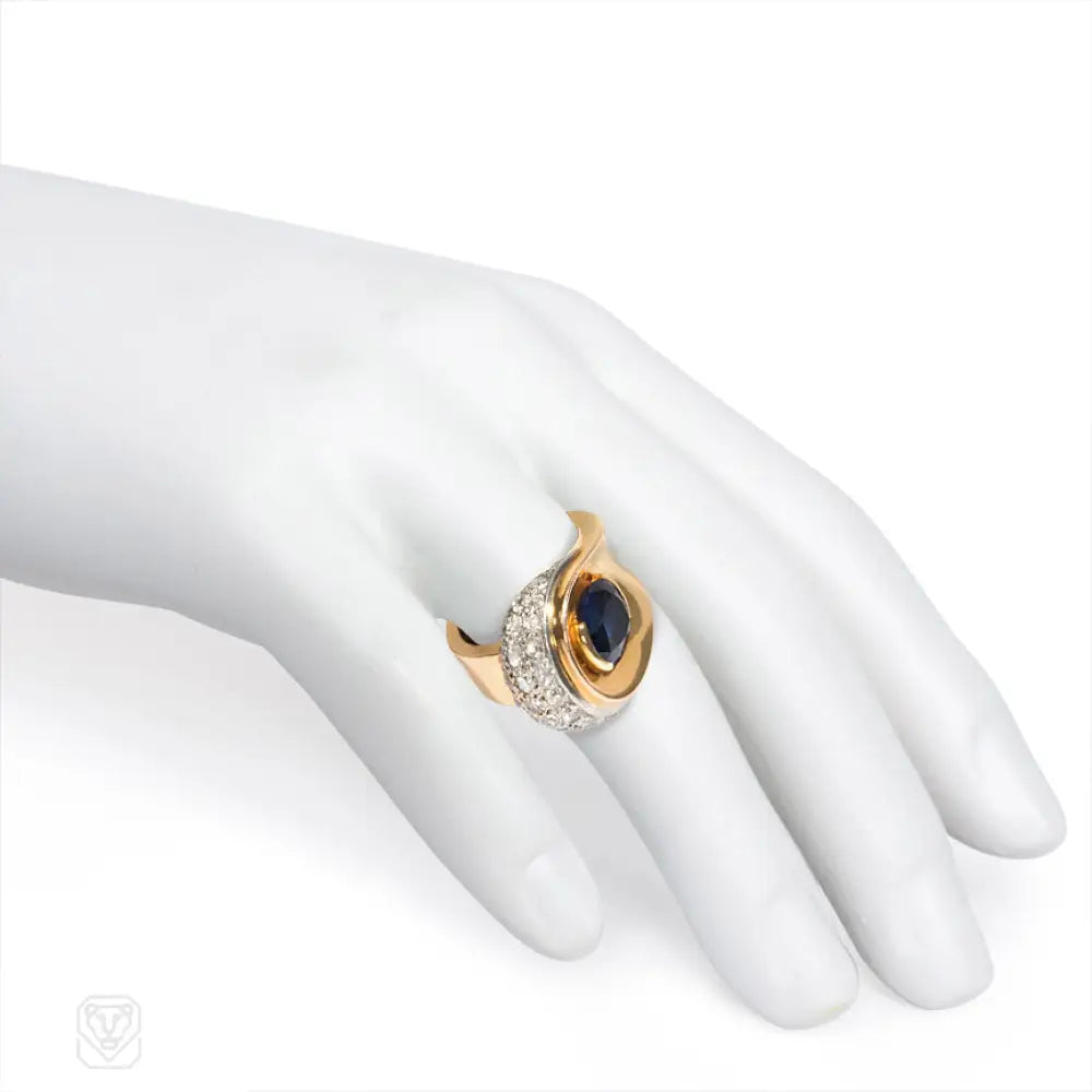 A Retro gold ring of buttoned design centering on an oval sapphire with a pavé diamond segment, in 18k and platinum. Sapphire approx. 3.16 ct.; atw. diamonds 1.50 ct. France.