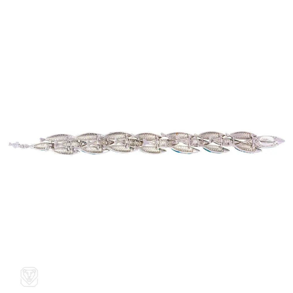 A stainless steel and enamel school of fish bracelet in green and blue tones with carved backbone detail on verso. Simon Harrison, England, Electra Collection. Size: Small (also available in Medium)