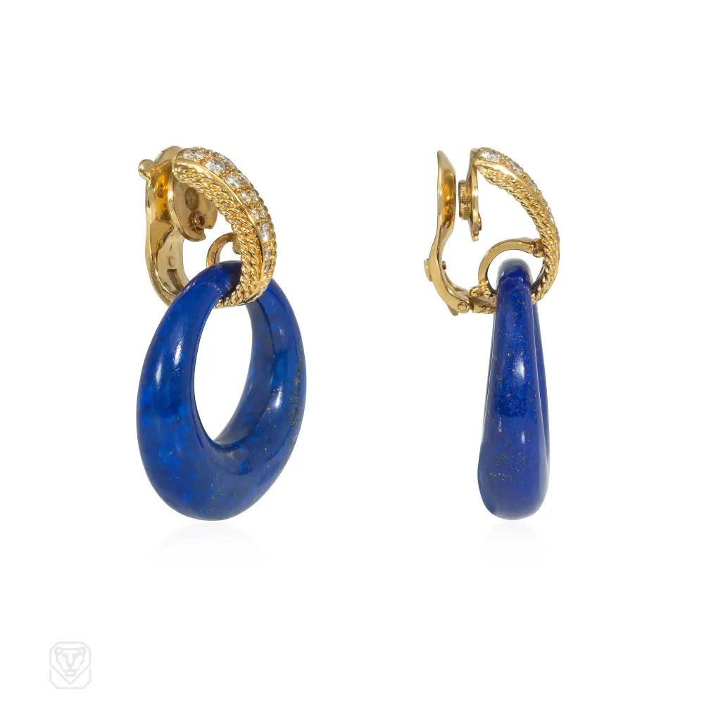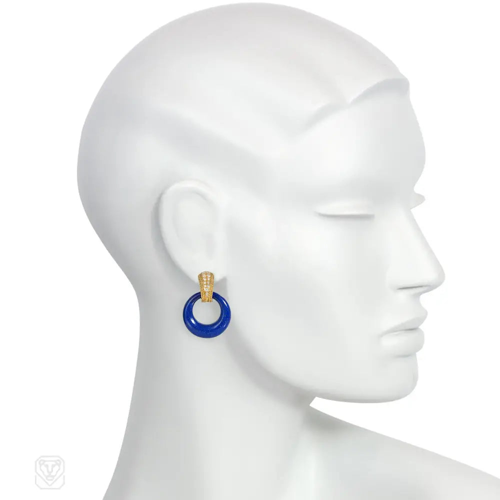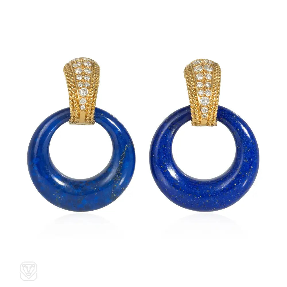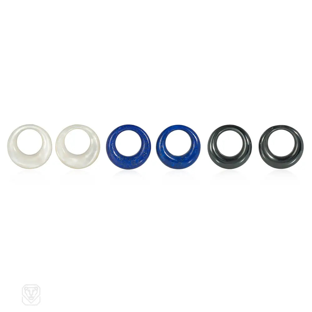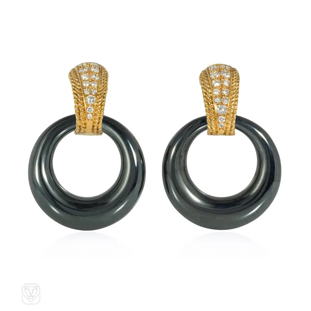 A pair of Mid-century doorknocker earrings comprised of gold and diamond surmounts with three sets of interchangeable hardstone hoops in lapis, abalone, and hematite, in 18k. Atw diamonds .88 cts. Van Cleef & Arpels, France. Pery et Fils. #B3015, A490