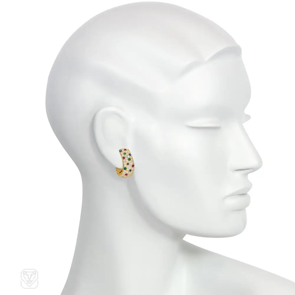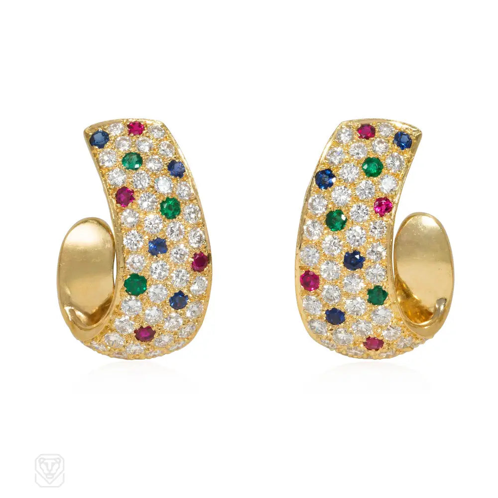 A pair of multi-gem and gold stylized half-hoop earrings, embellished with pavé diamonds, sapphires, emeralds, and rubies on the exterior, and polished gold interiors, in 18k. Van Cleef & Arpels, New York. #NY57012. Atw diamonds 2.40 cts.