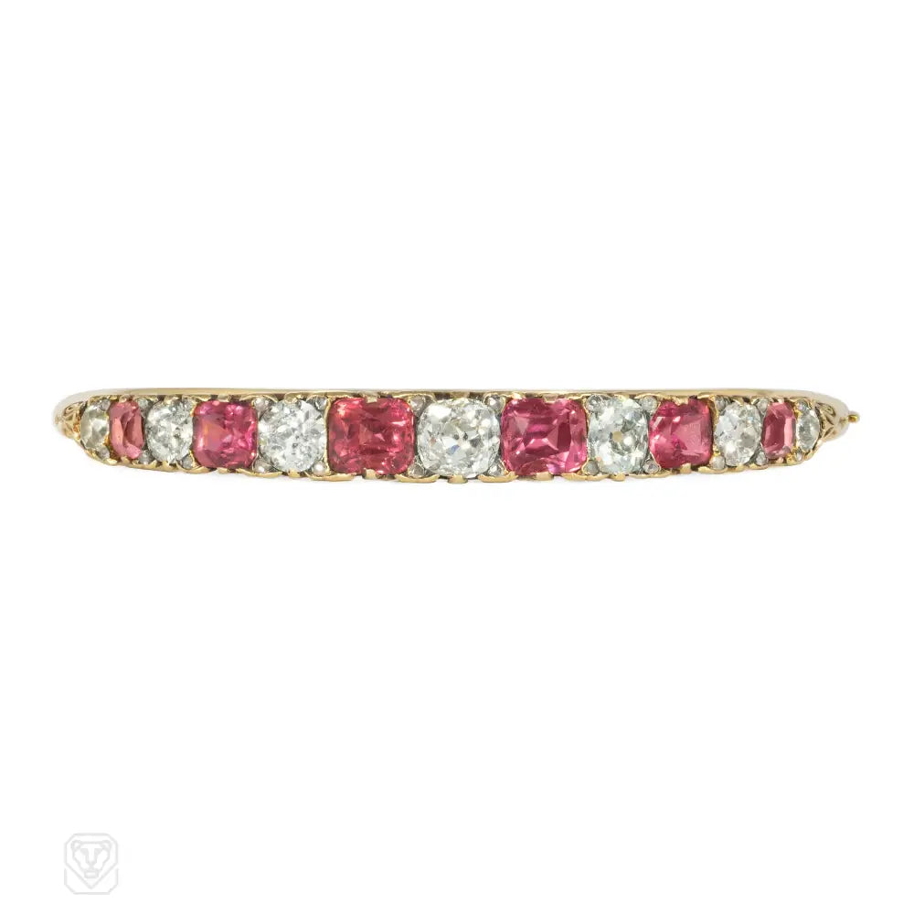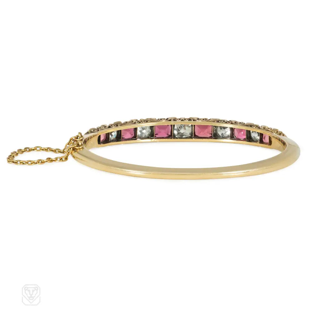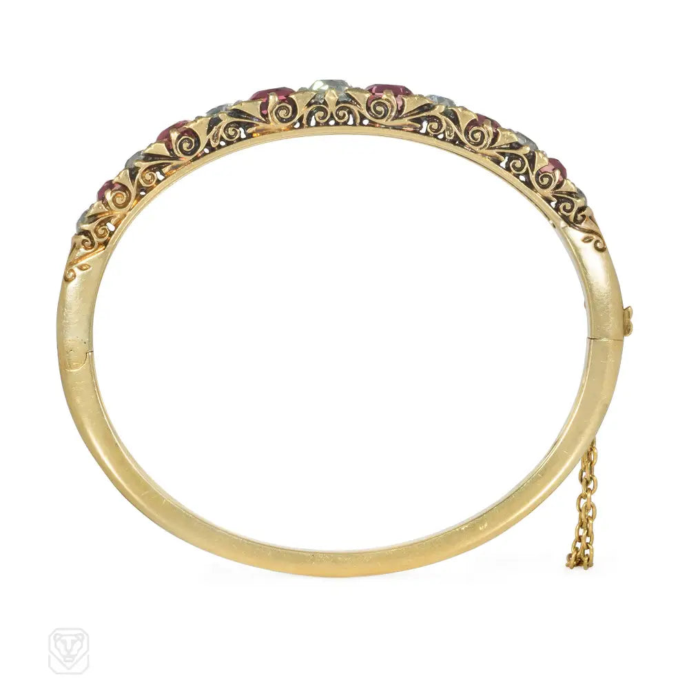 A Victorian carved gold half hoop bangle set with alternating tourmalines and old-mine diamonds, in 15k. Atw diamonds 4.25 cts.