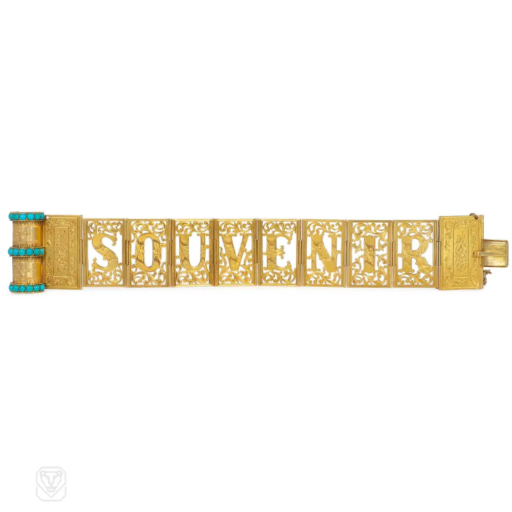 A Victorian gold and turquoise bracelet designed as a folded book with engraved arabesque decoration and cabochon turquoise on the spine, which opens to reveal etched foliate openwork panels spelling "SOUVENIR", in 18k.