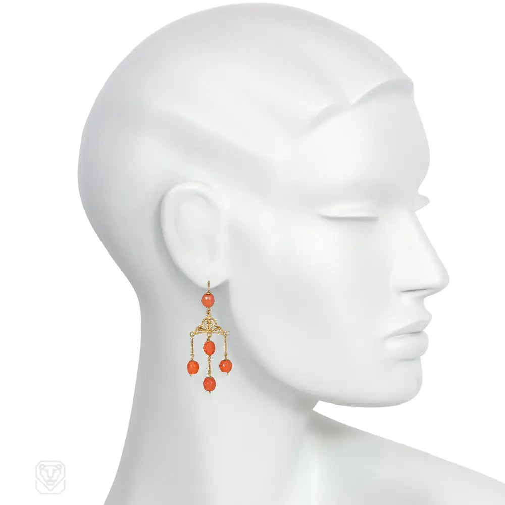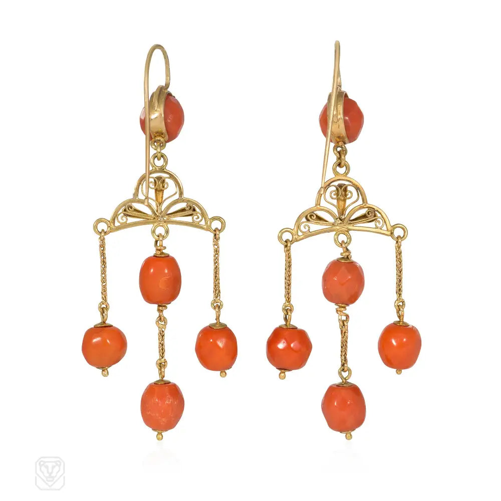 A pair of antique gold filigree earrings of girandole design comprised of wheat chain suspending faceted coral beads, in 18k. France