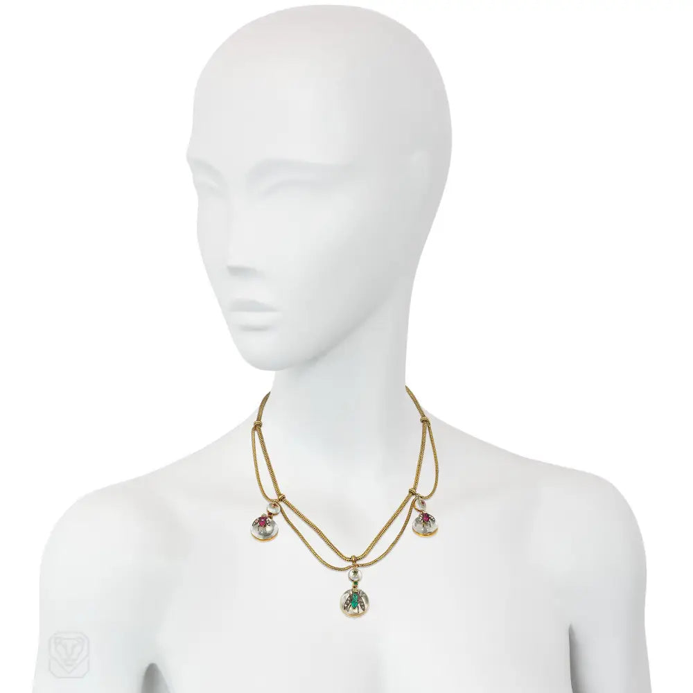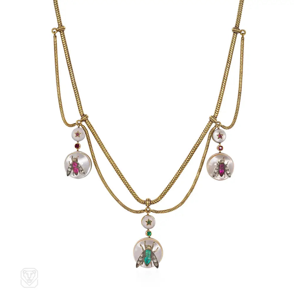 A Victorian gold festoon necklace comprised of carved rock crystal pendants set with ruby, emerald, diamond insects with star-set surmounts, in 15k