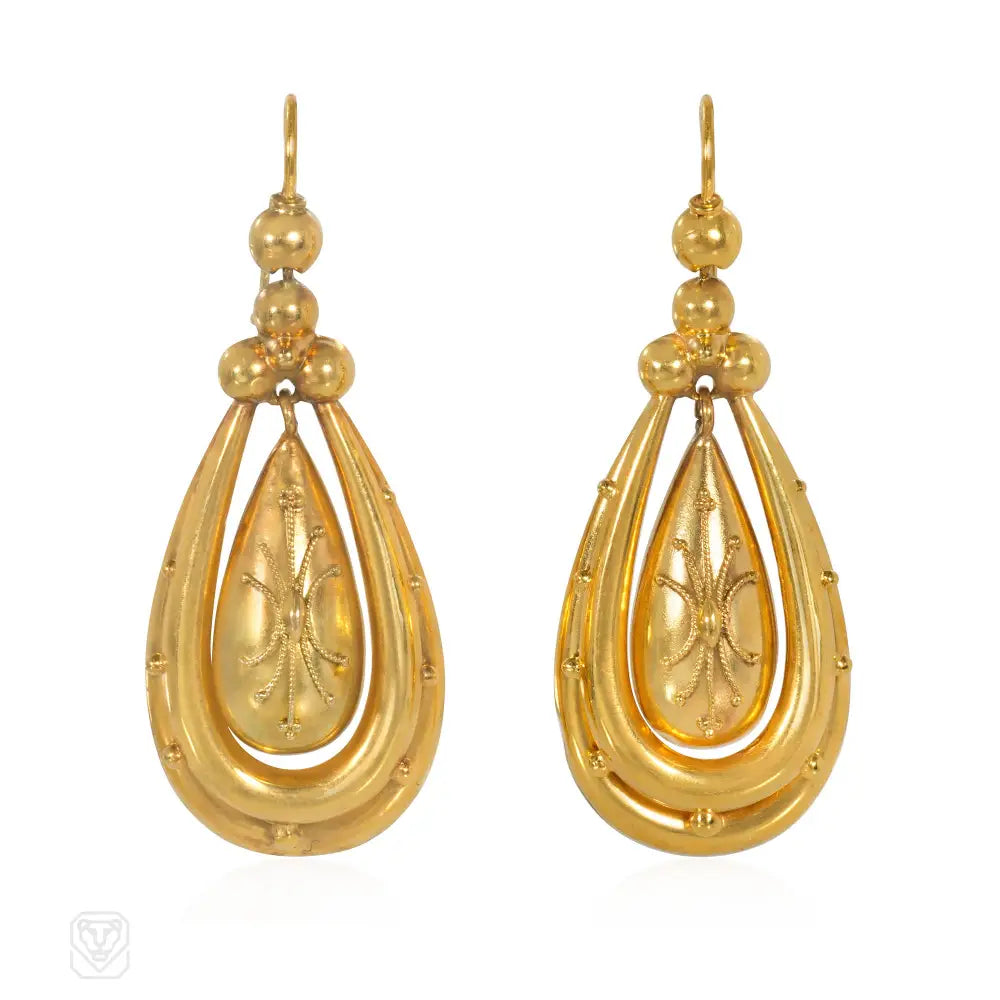 A pair of Victorian gold drop pendant earrings with double drop frames with gold beading in 15k.