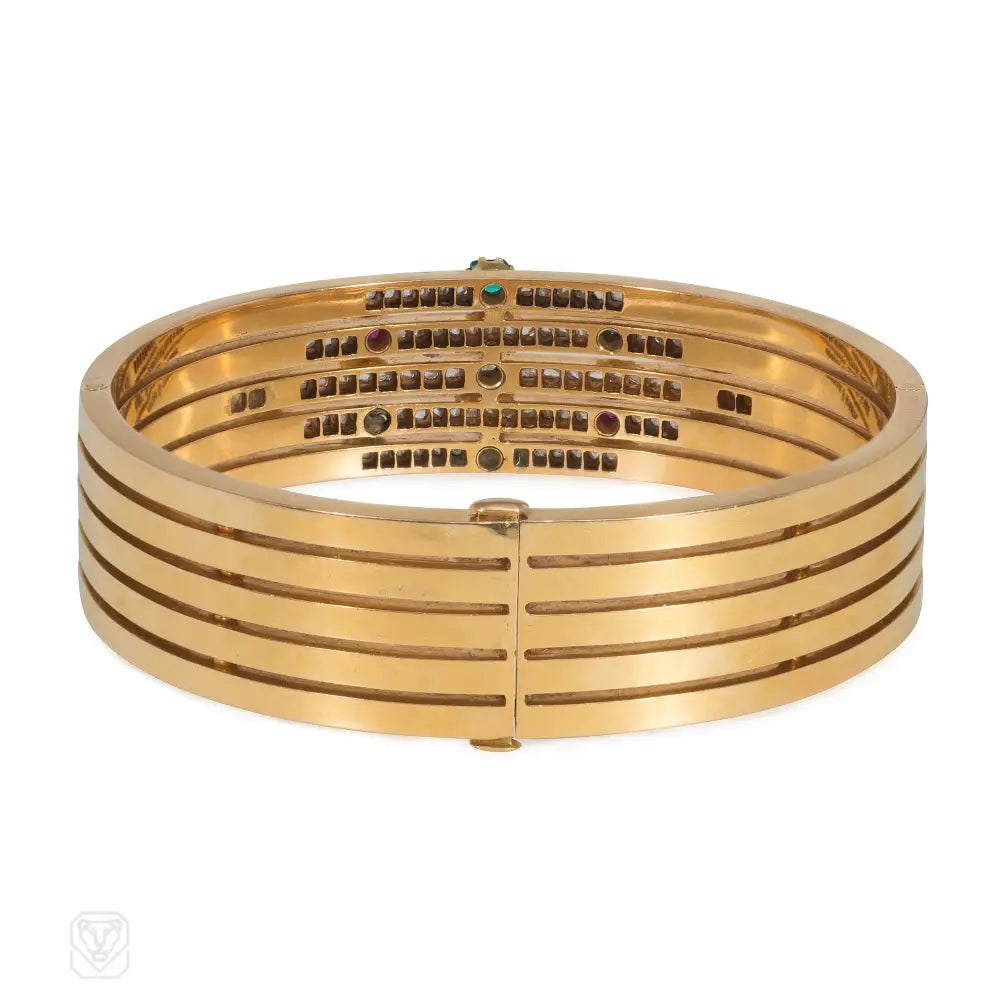 An antique gold bangle bracelet comprised of five bands inlaid with diamonds in a geometric motif and set with sapphires, emeralds, rubies, and pearls, in 18k. Austro-Hungary