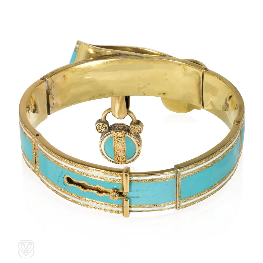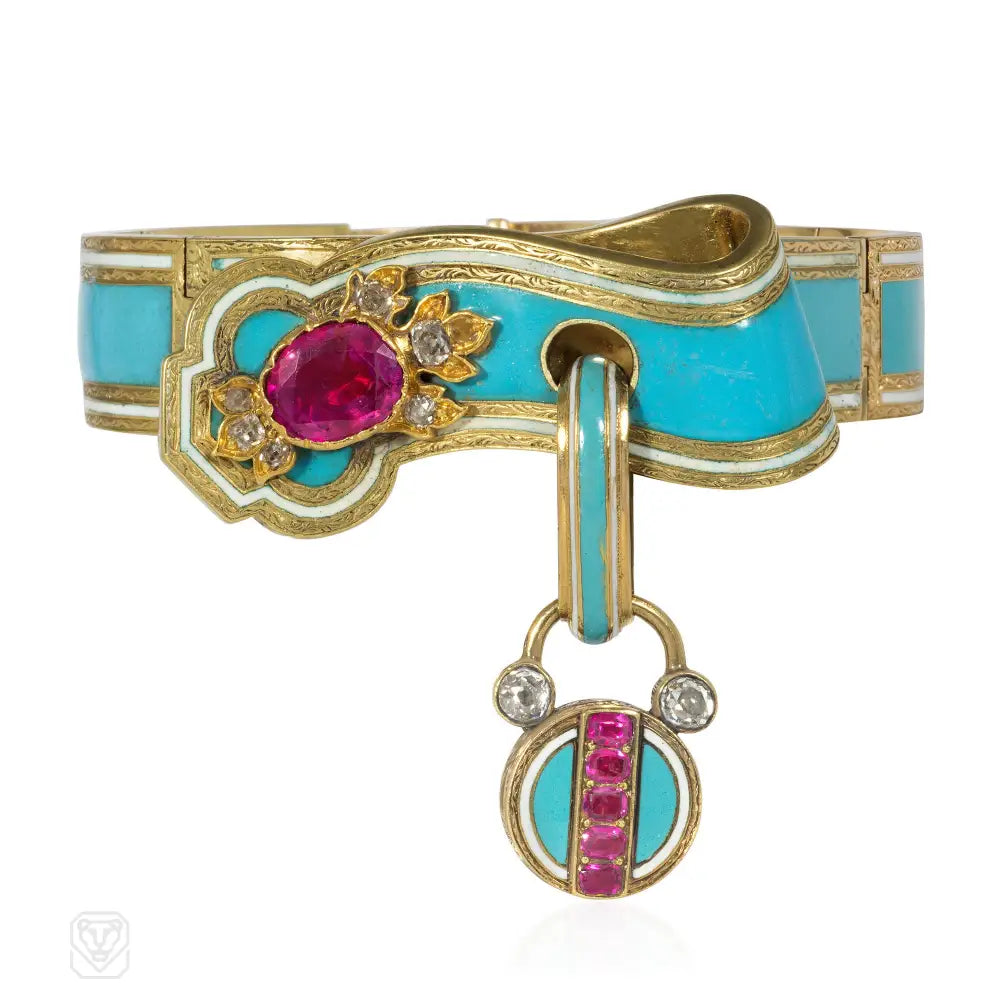 Early Victorian turquoise enamel, ruby, and diamond padlock bracelet