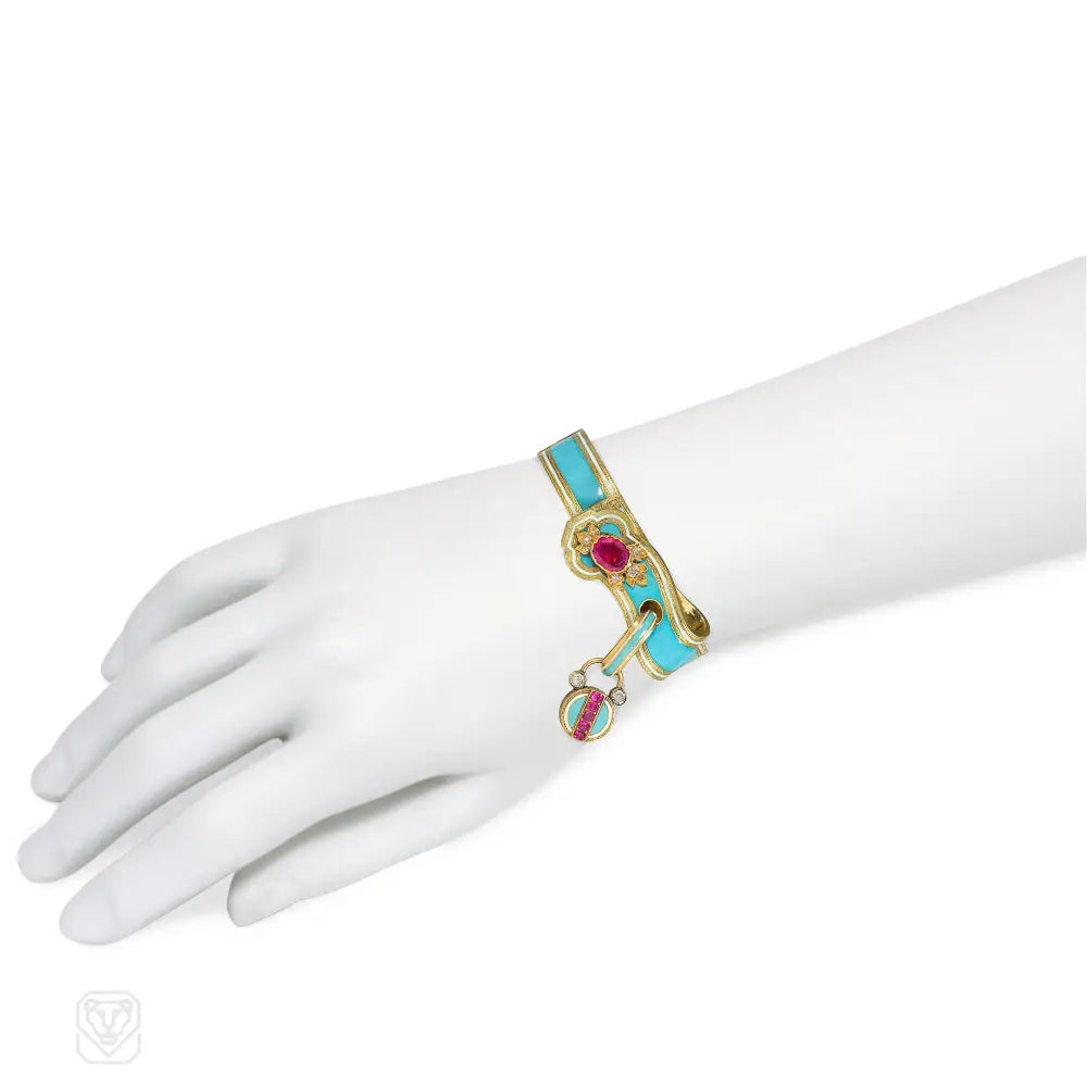 An antique chased gold and turquoise and white enamel bracelet designed as a scrolling ribbon garter with a large ruby, and a padlock locket set with rubies and diamonds, in 18k. French import. Atw diamonds .25 ct.