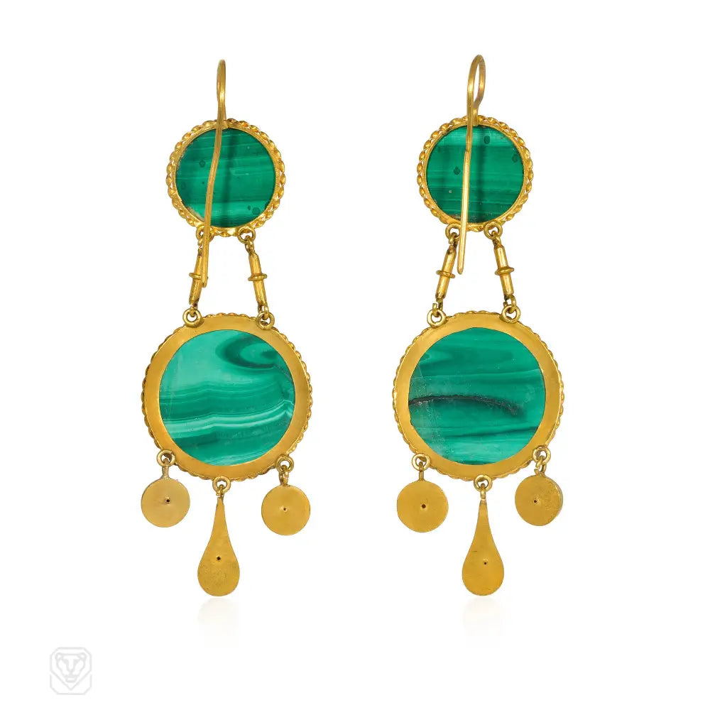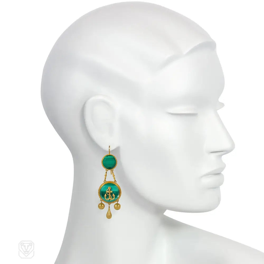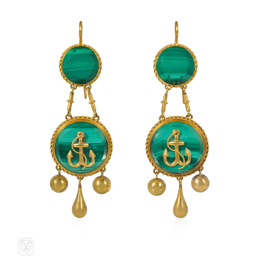A pair of antique gold and malachite pendant earrings with an anchor motif and girandole drop pendants, in 18k. France