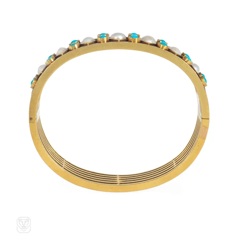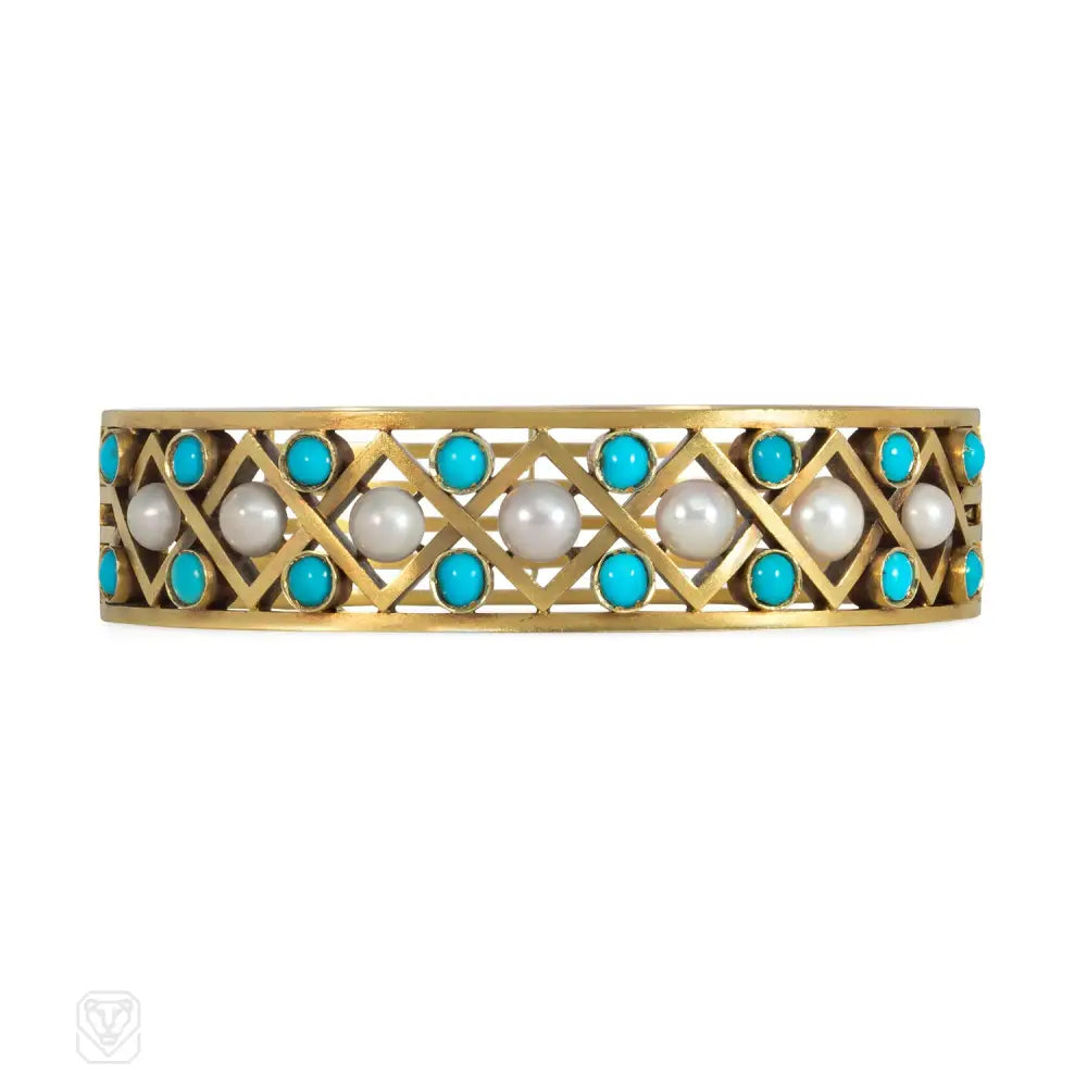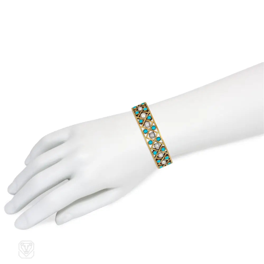 An antique gold cuff bracelet with a latticed front panel set with half pearls and turquoise cabochons, in 14k. Russia