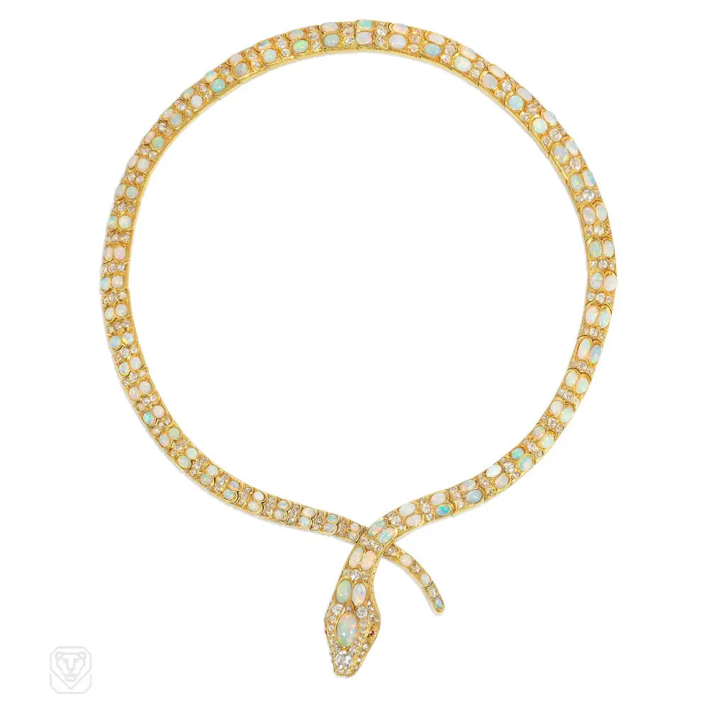 An Important Antique bypass necklace designed as an articulated and tapering serpent with alternating bands of old-mine-cut diamond and opal scales featuring ruby eyes, in 18k gold. Atw diamonds 10.5 cts.